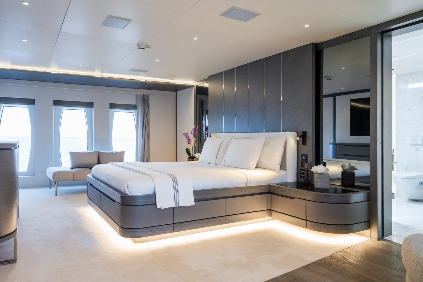 On the main deck there is a shady aft deck with twin dining tables and open-air lounge which leads to the semi-circular sunbathing area on the roof of the curved entrance to the beach club.