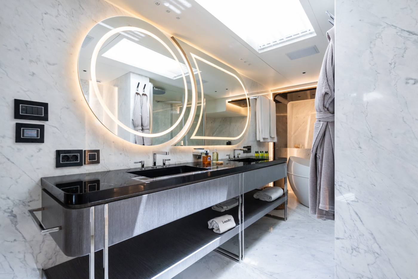 On the sun deck, there is a jacuzzi pool with waterfall from the roof, a teppanyaki grill and BBQ, plus a dining table with an opposite lounge, a DJ console and space for dancing. For seating, there is a sociable seating area ...