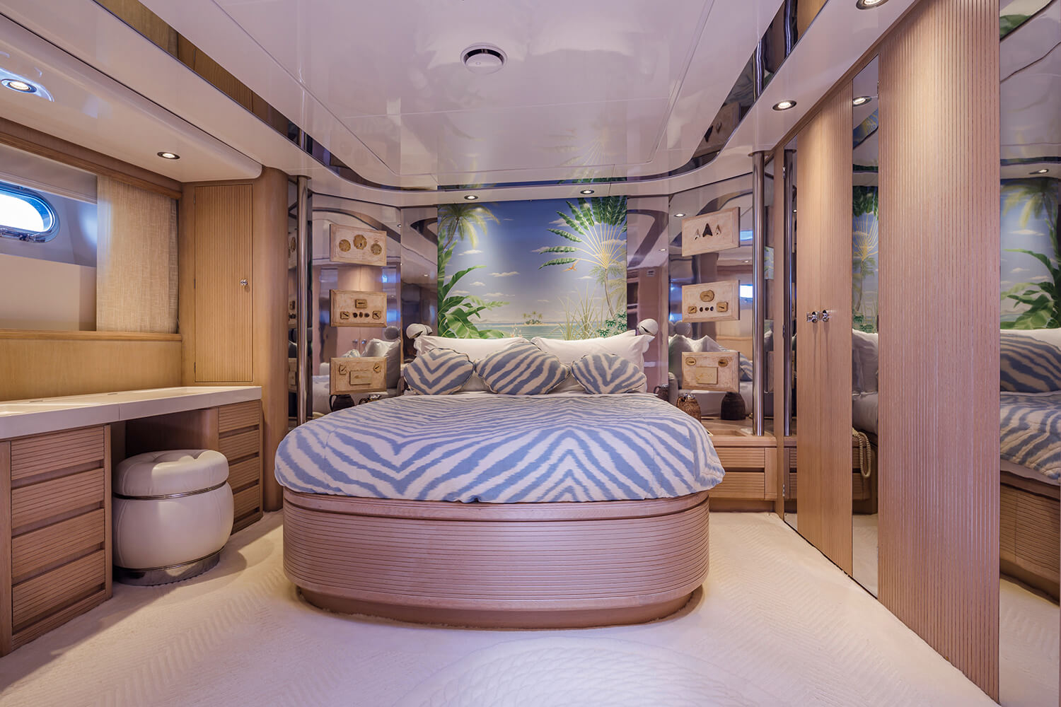 The three guest suites echo the fresh and light décor seen in the main salon and also have lively, nautical wall paintings and colourful bed linen. The suites are configured as one master suite and two twin cabins, all with their owner ensuite bathroom facilities.