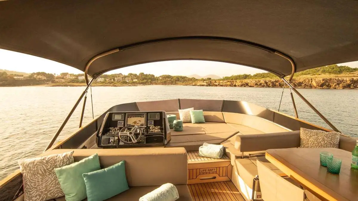 NOTABLE FEATURES OF AMMONITE: ~Sleek flybridge design ~Overwater hammock ~Canopy shades for foredeck and sun deck ~Cool beach vibe interior ~Air conditioning ~WiFi