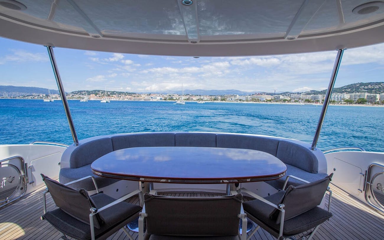 The main deck aft presents guests with an alternative al fresco dining space sheltered by the flybridge overhang. There is a curved sofa seat and moveable chairs surrounding the table. Steps either side lead down to the swim ...