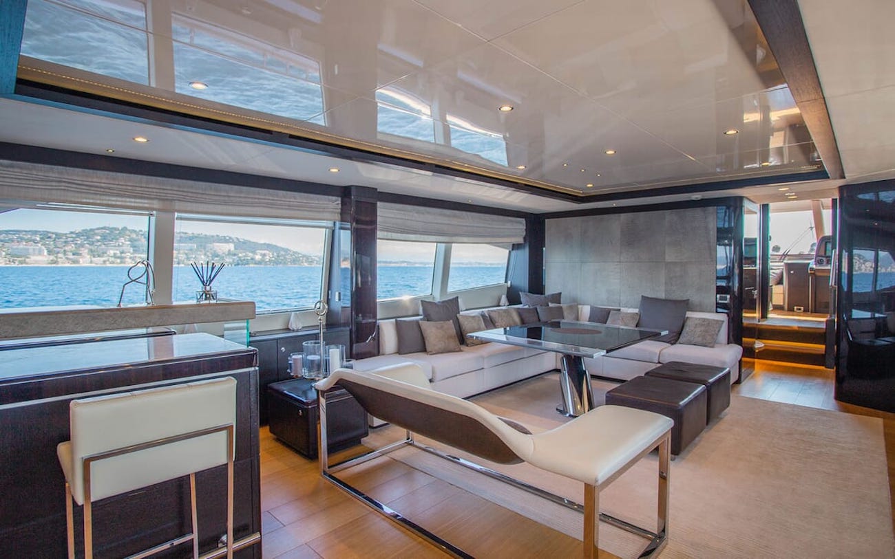 The foredeck is configured with a row of sun pads and a sofa below the wheelhouse windscreen.