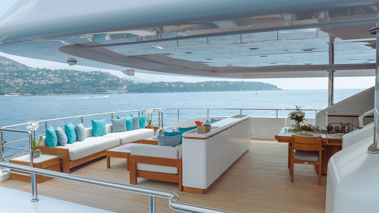 Large glass sliding doors open onto the aft deck where panoramic views from the stern of Leander G can be enjoyed.