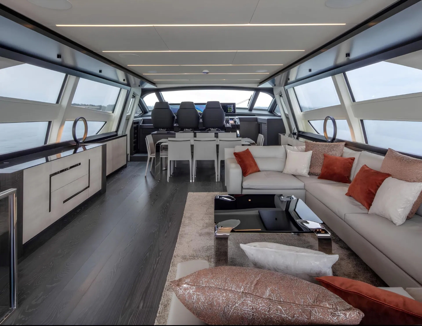 The main salon offers a sociable open plan lounge and dining room with leather sofas and a contemporary dining table to seat eight. Forward is a row of captain’s chairs at the helm controls. The décor is a blend of neutral greys and sleek furniture.