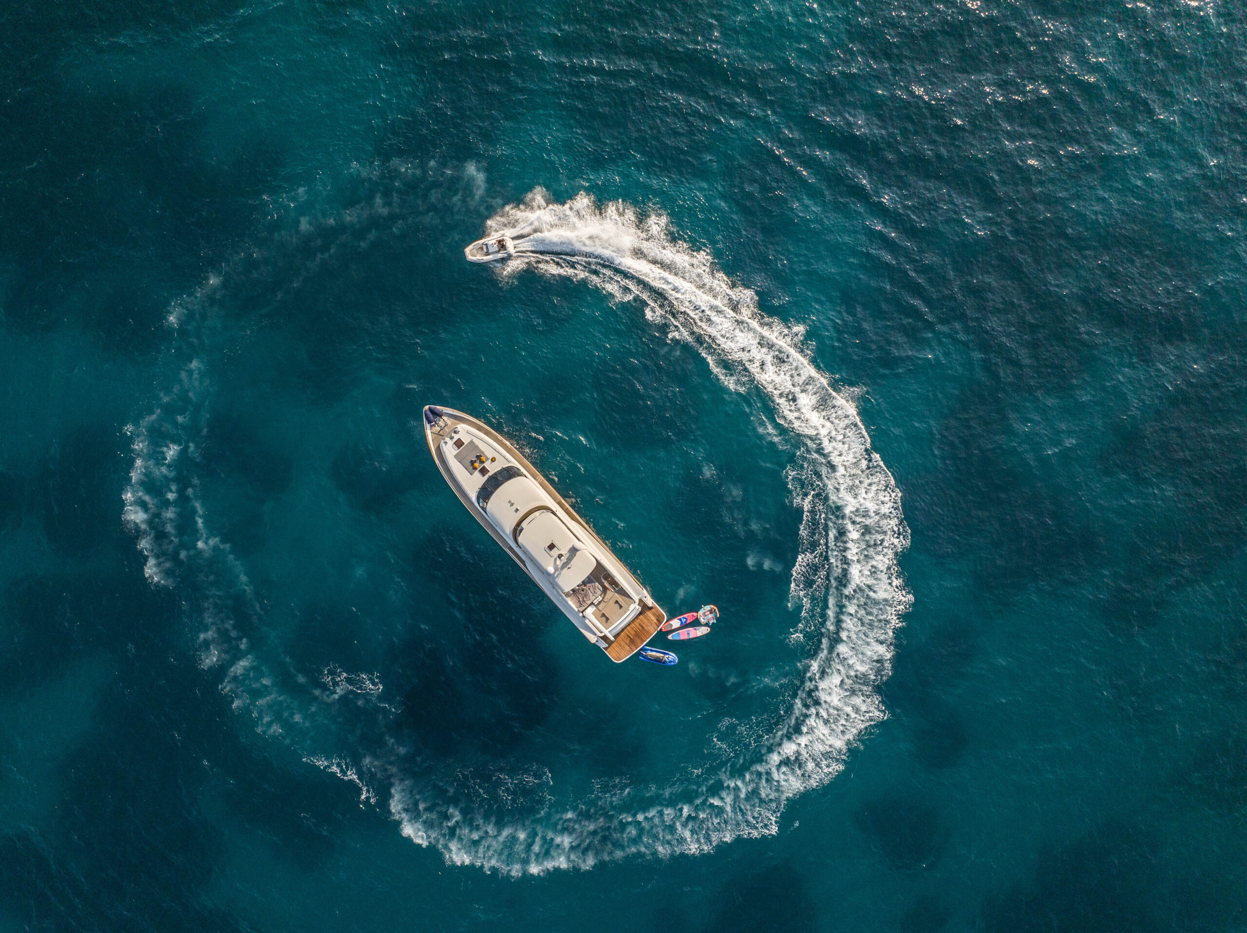 Sunbathing is available on the foredeck sun pads and aft facing adjustable beds on the sun deck. Water toys can be launched, and guests can swim from the water’s edge swim platform accessed down steps from the main deck aft.