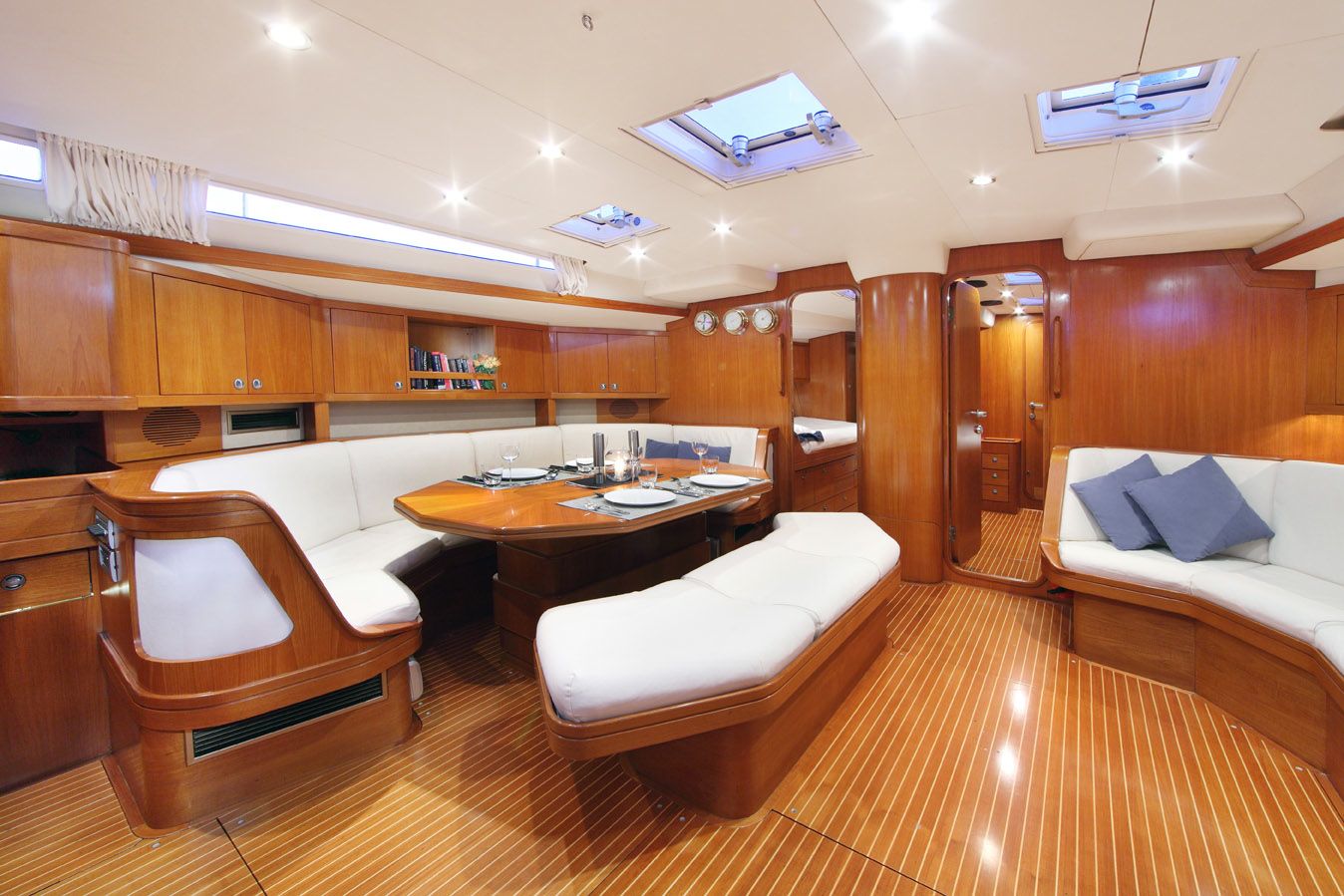 The salon is an open plan, offering a large settee, sofa and formal dining table. Teak and holy inlaid floors, warm wood panels and crisp white soft furnishings, create a minimalistic and spacious ambiance. Side ports and overhead hatches bring in ample natural light.