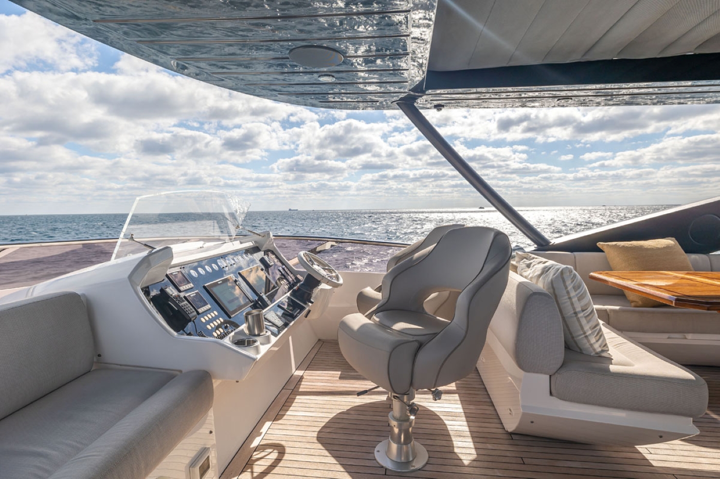 There is a double cushioned sun pads aft to starboard with dining setting and bar amidships under the hard roof and helm controls and bench seat forward. The hard roof has a soft retractable section to allow for full sun if required.