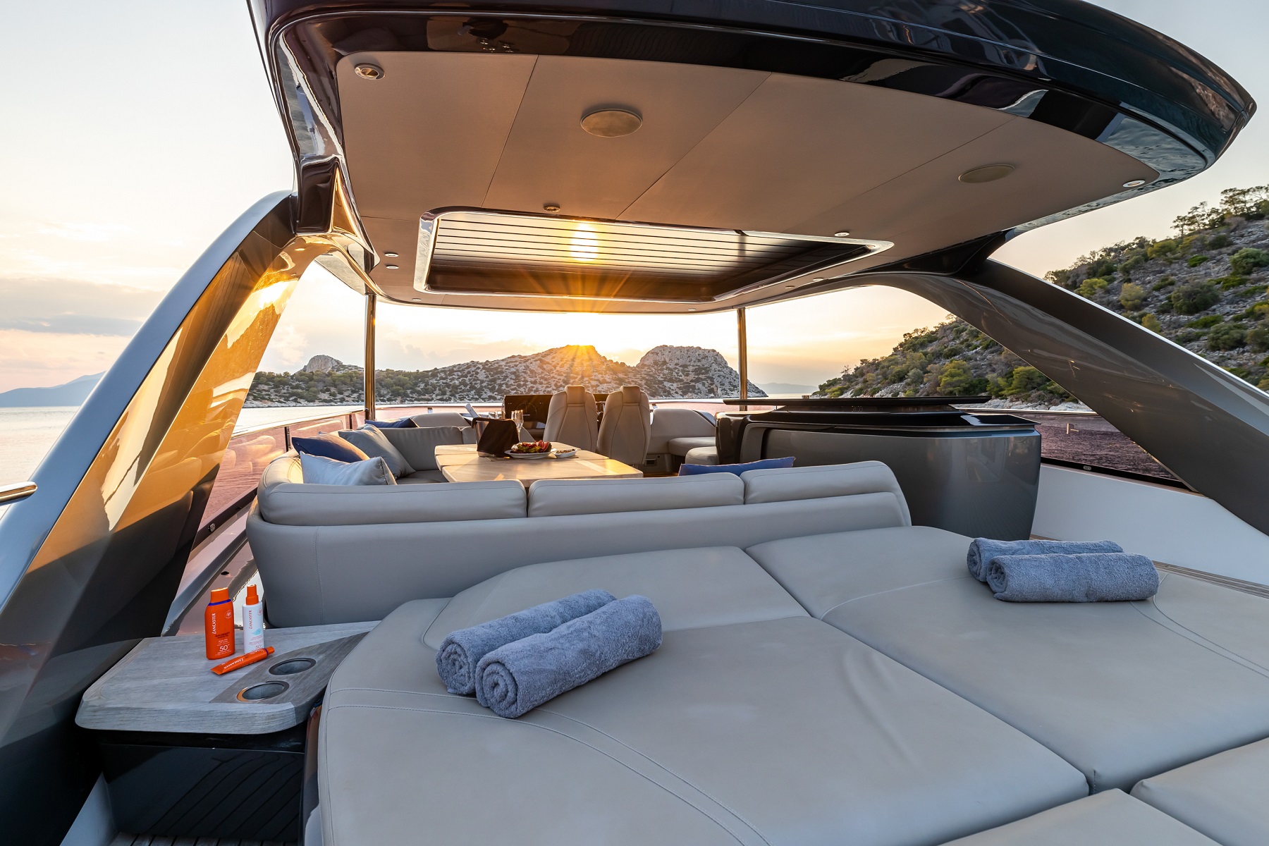 NOTABLE FEATURES OF VISTA: ~Sociable exterior ~Panoramic windows in main salon ~Submersible swim platform ~At anchor ...