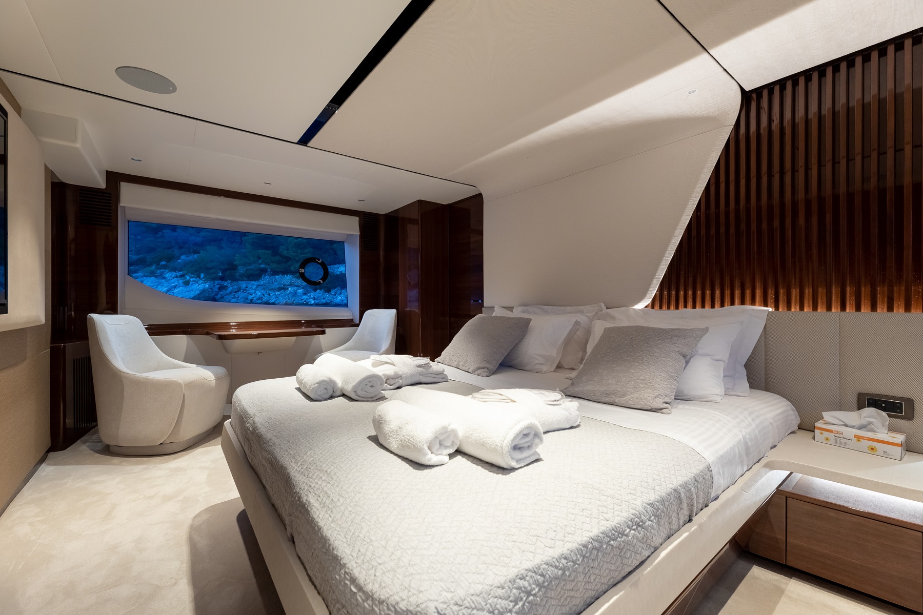 Accommodation is for up to eight guests in four suites with a crew of four on board to manage the charter.
