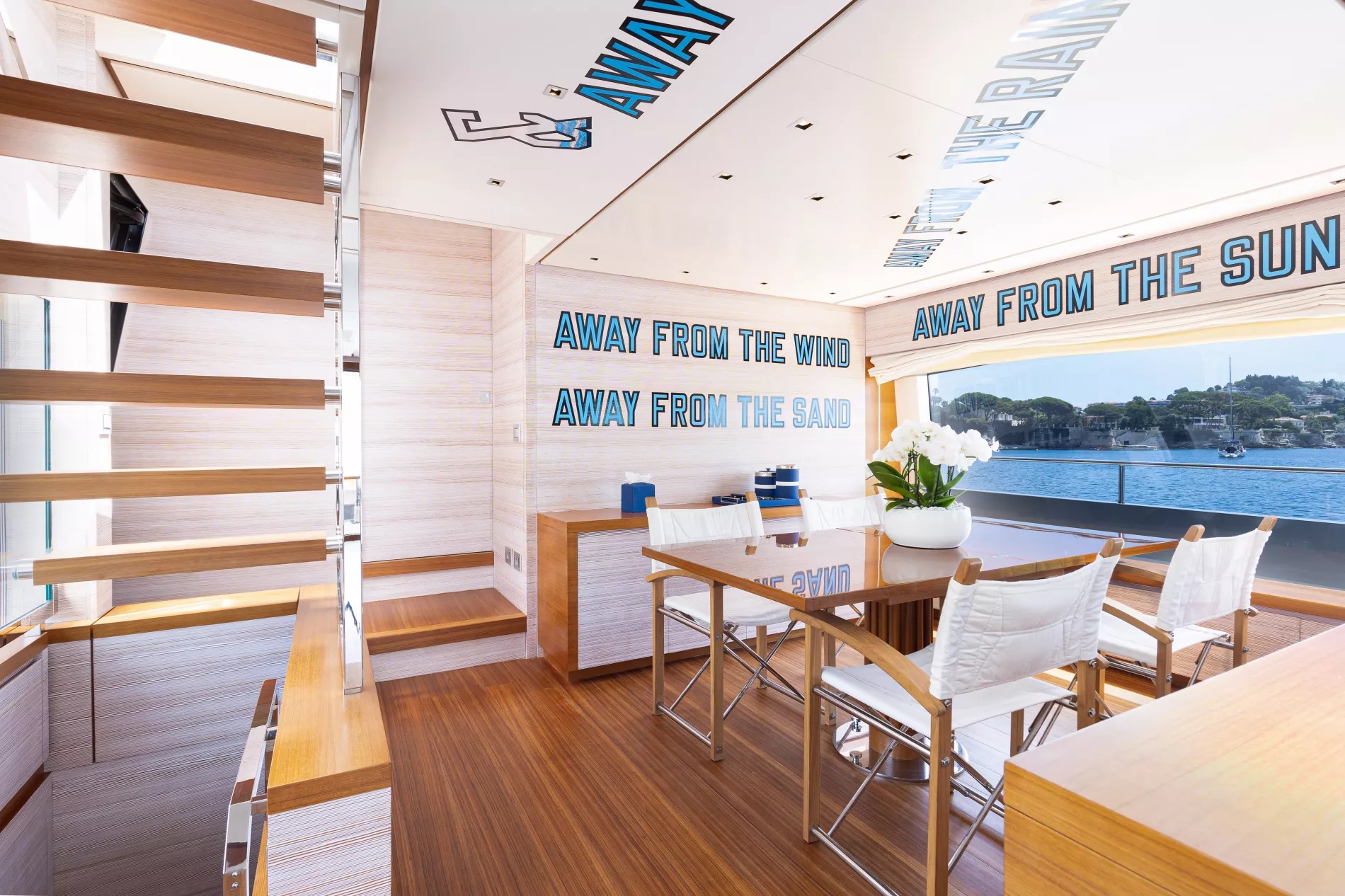 The main salon offers a spacious corner lounge with a coffee table which cleverly contains additional stool seating. There is a TV, plenty of storage and panoramic windows plus glass doors out to the aft deck. The dining room is forward and separated by low built in cabinetry.