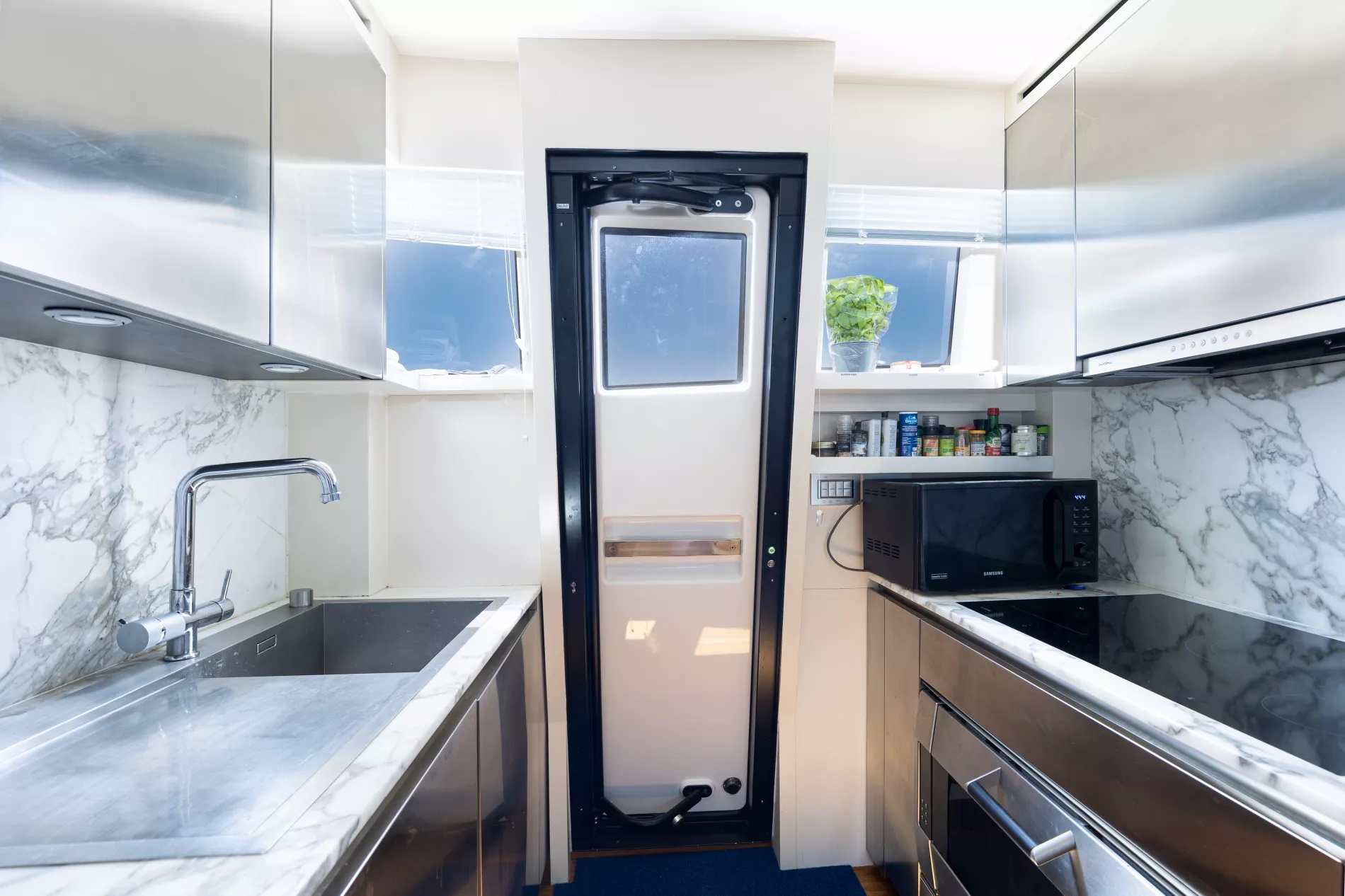 Amidships finds the galley to starboard and the pantry to port and forward is the wheelhouse with additional guest seating.