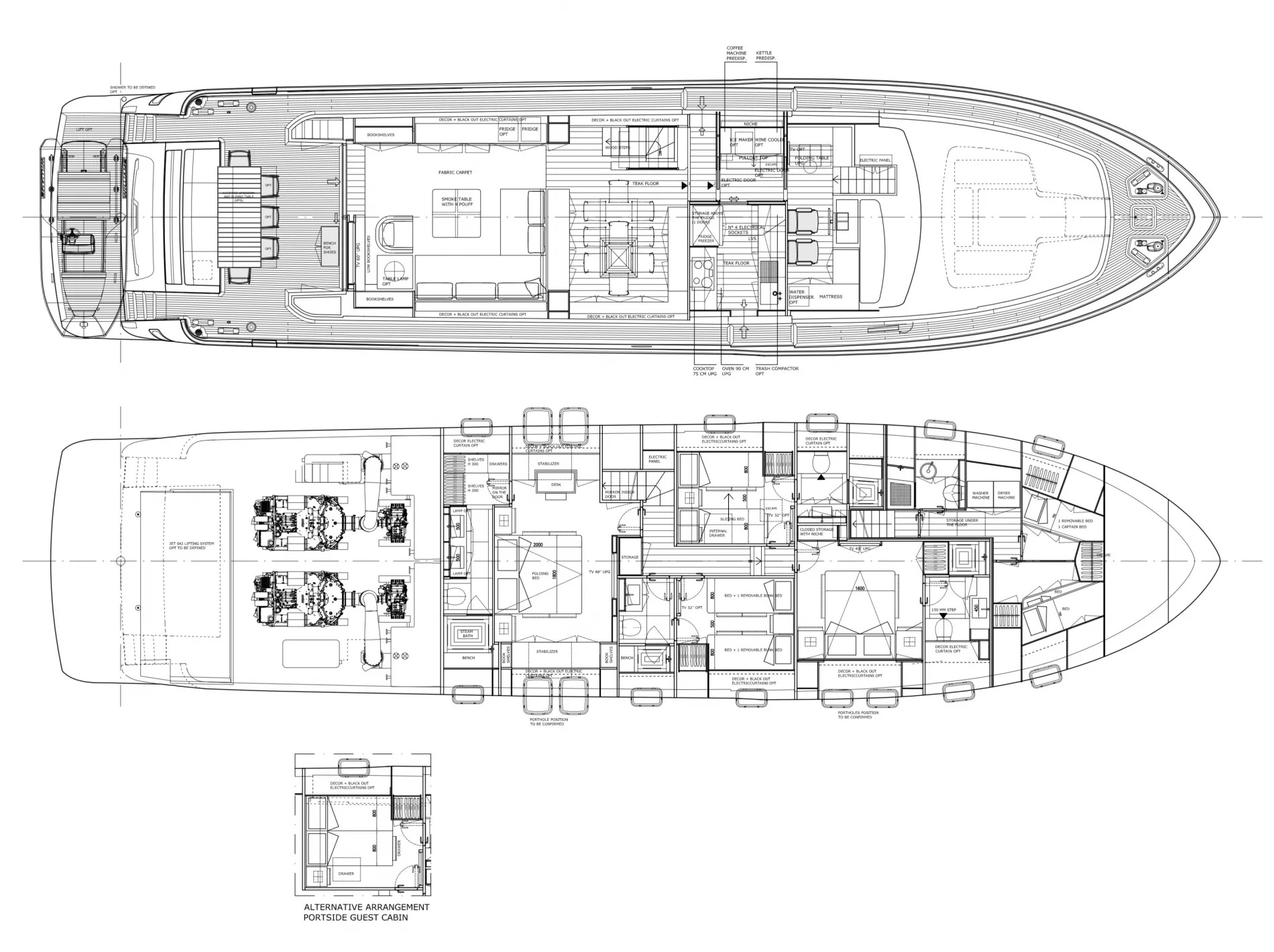 The guest accommodation is on the lower deck. There is accommodation for up to 10 guests in four ensuite cabins. A full-beam master suite is located aft, a VIP cabin is forward, a convertible twin/double (sliding bed) to port, and a twin cabin with additional Pullman berths to starboard.