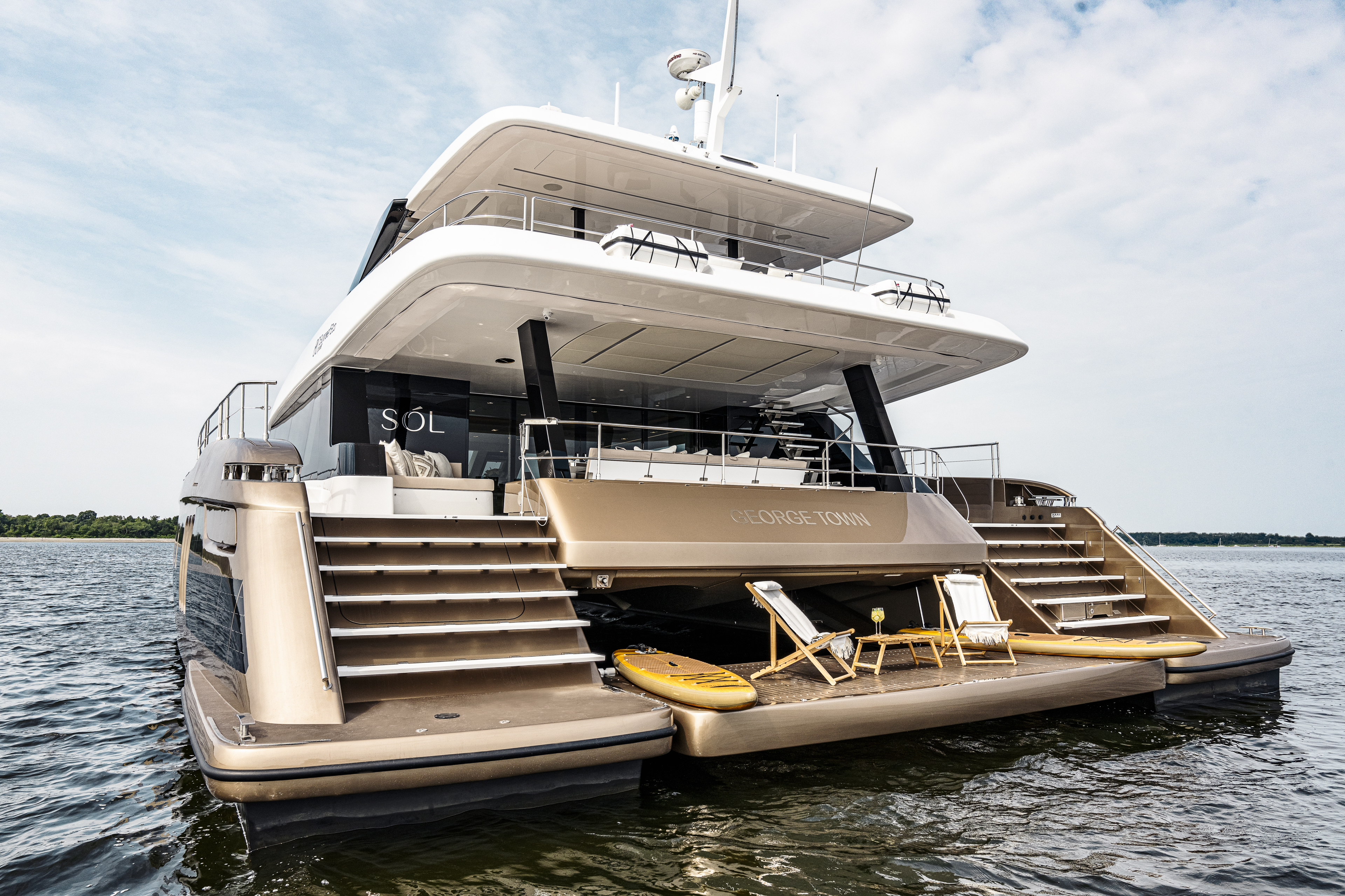 Her light and ultramodern solar power system covers up to 200m² of the yachts surface area and maximises solar energy generation, achieving 36kWp of capacity. Up to 8 guests can be accommodated on board.