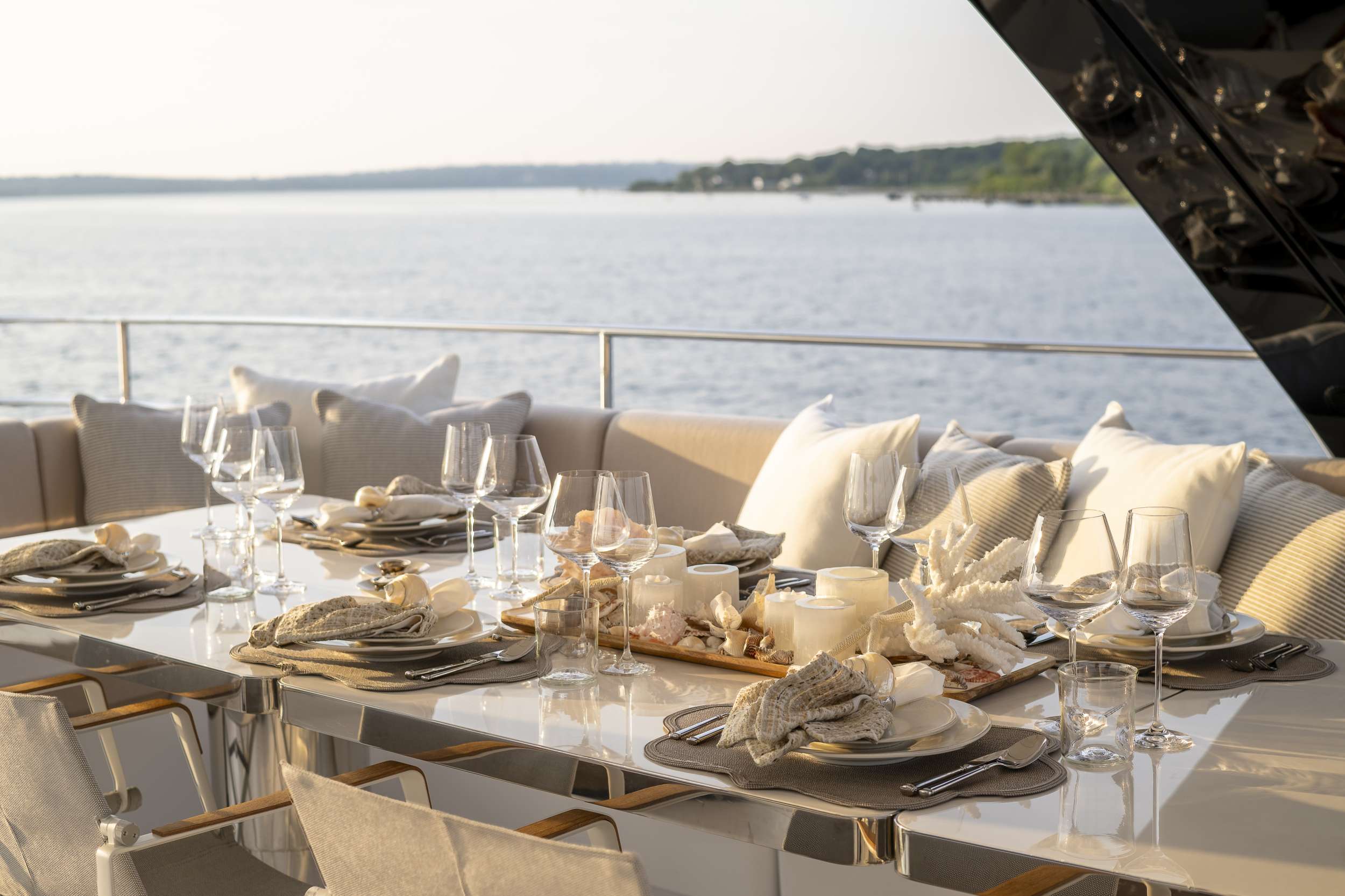 As well as her dramatic profile she offers generous entertainment space across her main deck and flybridge. The sun deck has a glass panelled hard roof which covers a dining setting, a lounge area and bar plus forward helm controls with guest sofas. A full beam row of sun pads fills the aft edge of the deck.