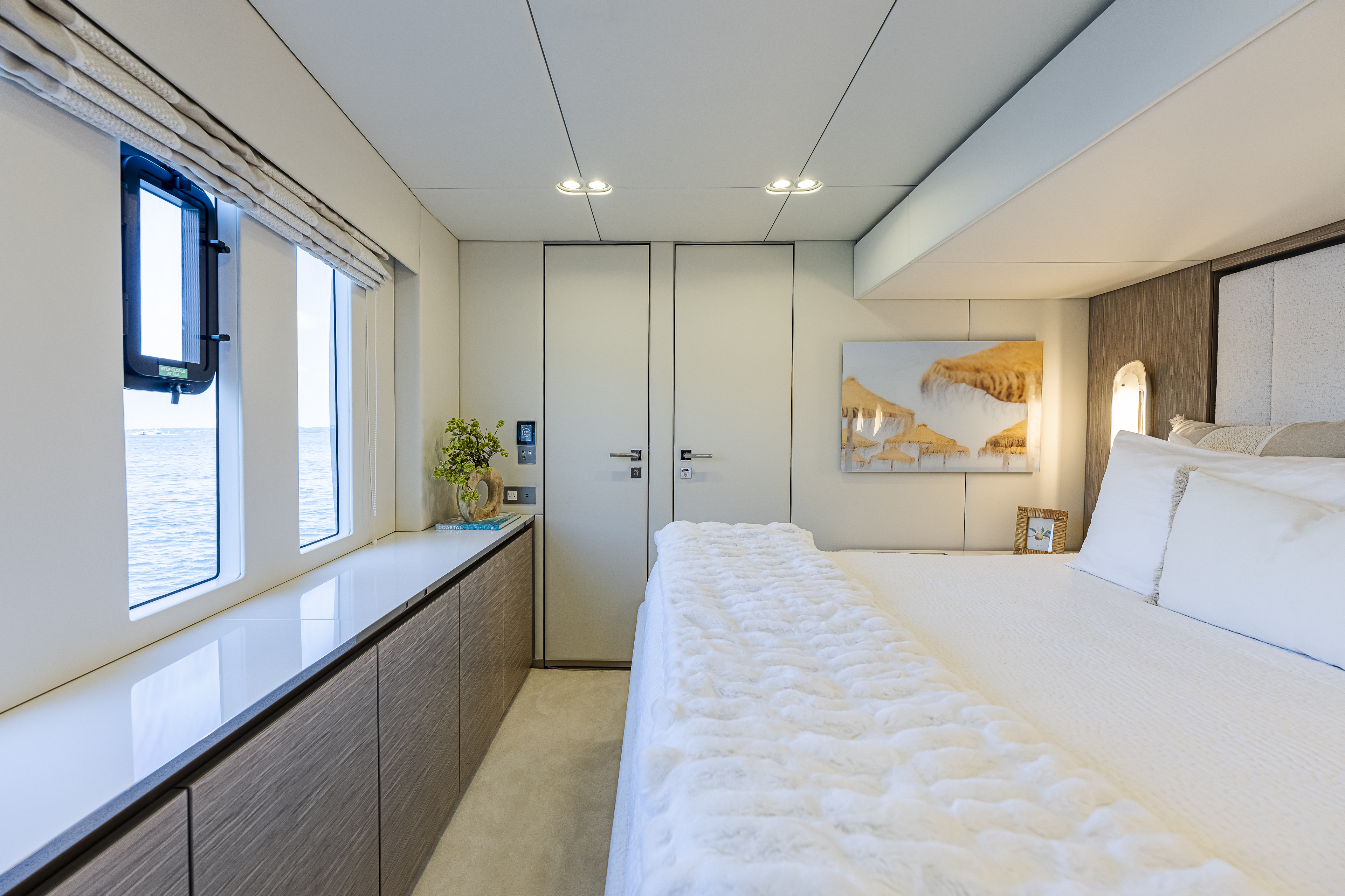 Her light and ultramodern solar power system covers up to 200m² of the yachts surface area and maximises solar energy generation, achieving 36kWp of capacity. Up to 8 guests can be accommodated on board.