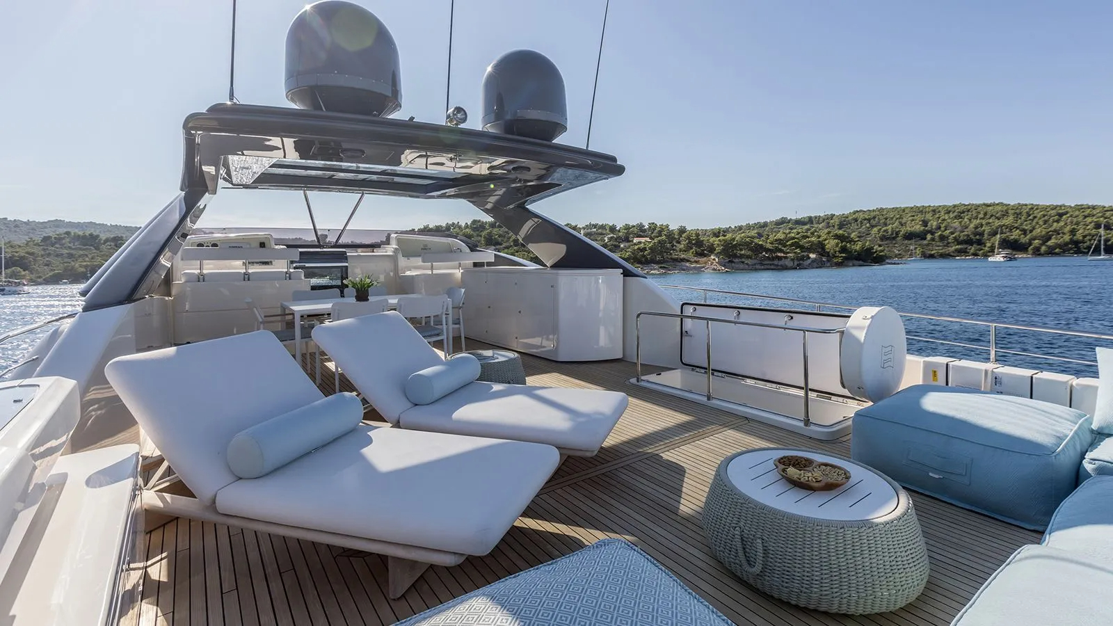 Up to ten guests can be accommodated in five suites which include a main deck master. There is additional accommodation for the five crew members.