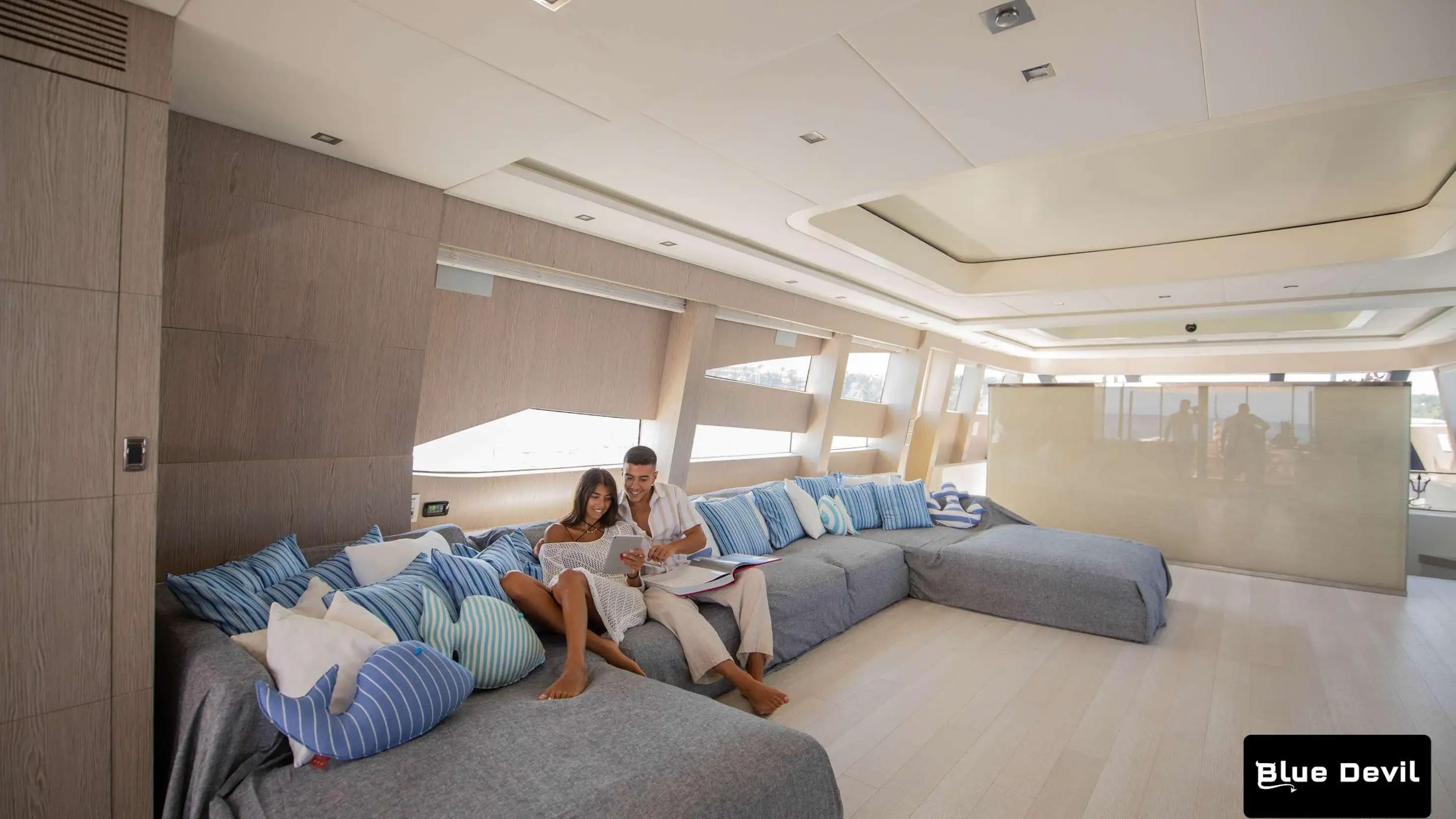 The main salon offers a huge, deep-cushioned, u-shaped sofa, large enough for all the guests to gather. There is a retractable roof section which really brings the outside in, and the helm controls are forward, separated by a partition.