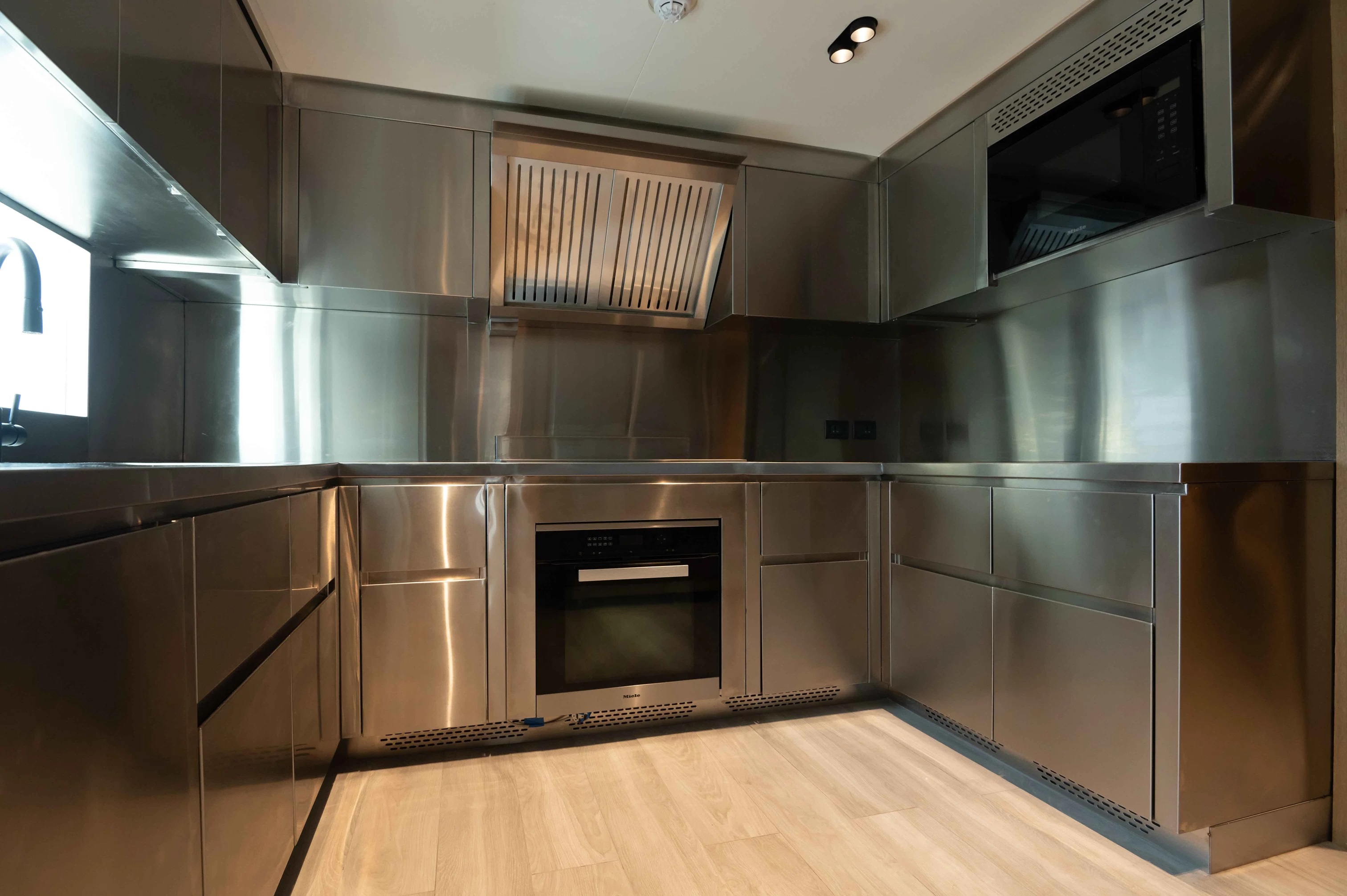 The lovely main salon is home to a lounge and dining area and is decorated with a blend of wood finishes, dark marble and reflective surfaces, plus contemporary lighting.