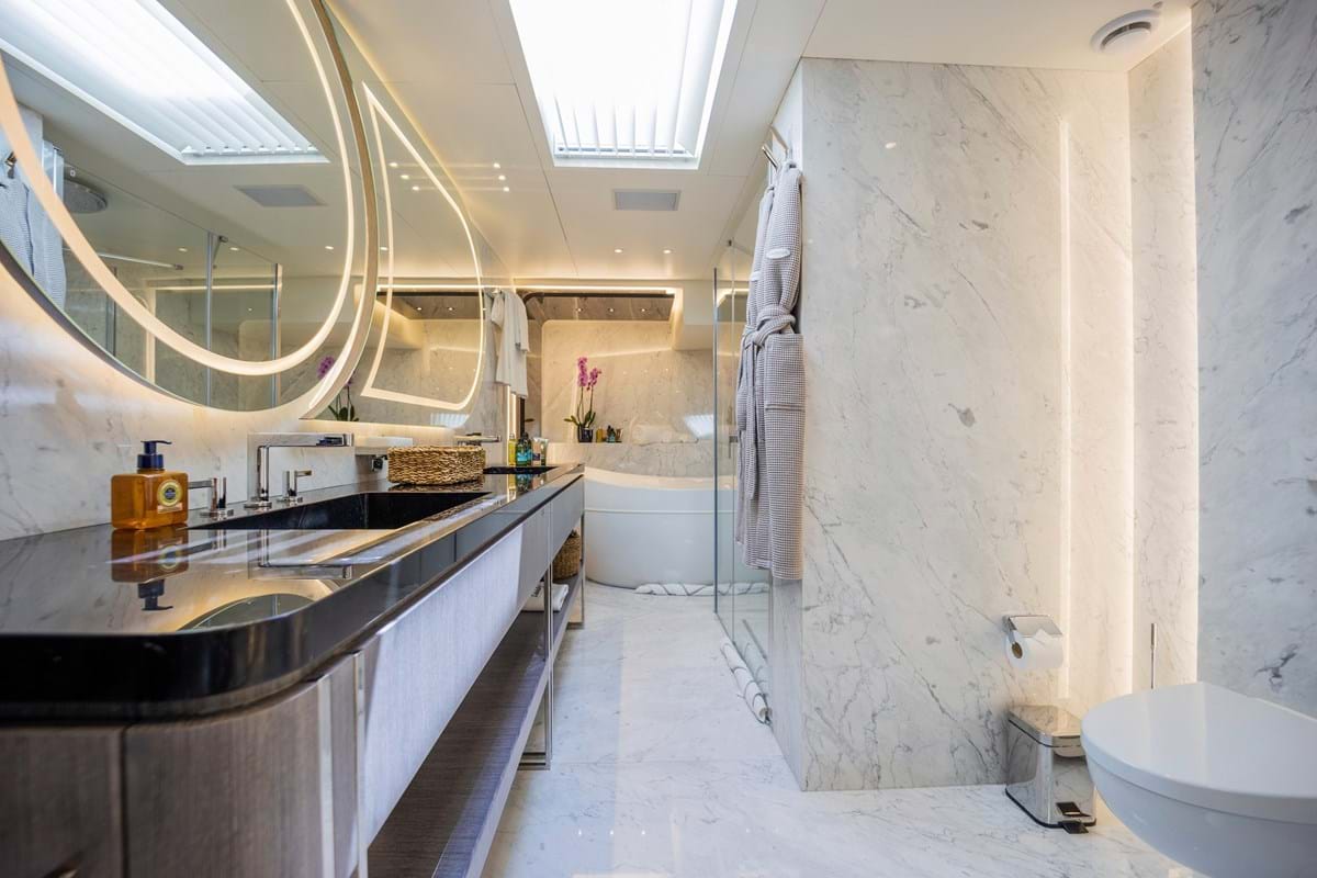 The master suite is forward on the main deck and boasts a separate study, huge wardrobes and superb ensuite bathroom. The other guest cabins are three doubles and a twin located on the lower deck. All the suites benefit from the ...