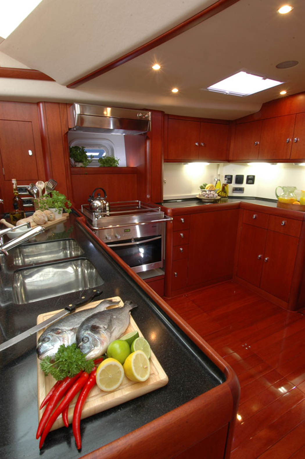 The lower salon is open plan with the galley, featuring a leather sofa and entertainment systems. The cabin arrangement will offer style and comfort for up to six guests in three cabins. The master cabin has a sumptuous double berth, settees, dressing table and two large hanging lockers and includes an en-suite bath, shower and head.