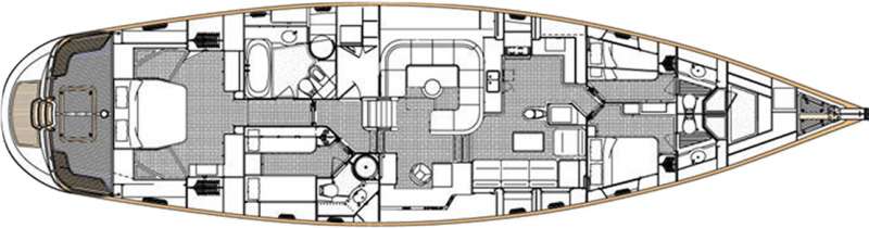 The lower salon is open plan with the galley, featuring a leather sofa and entertainment systems. The cabin arrangement will offer style and comfort for up to six guests in three cabins. The master cabin has a sumptuous double berth, settees, dressing table and two large hanging lockers and includes an en-suite bath, shower and head.