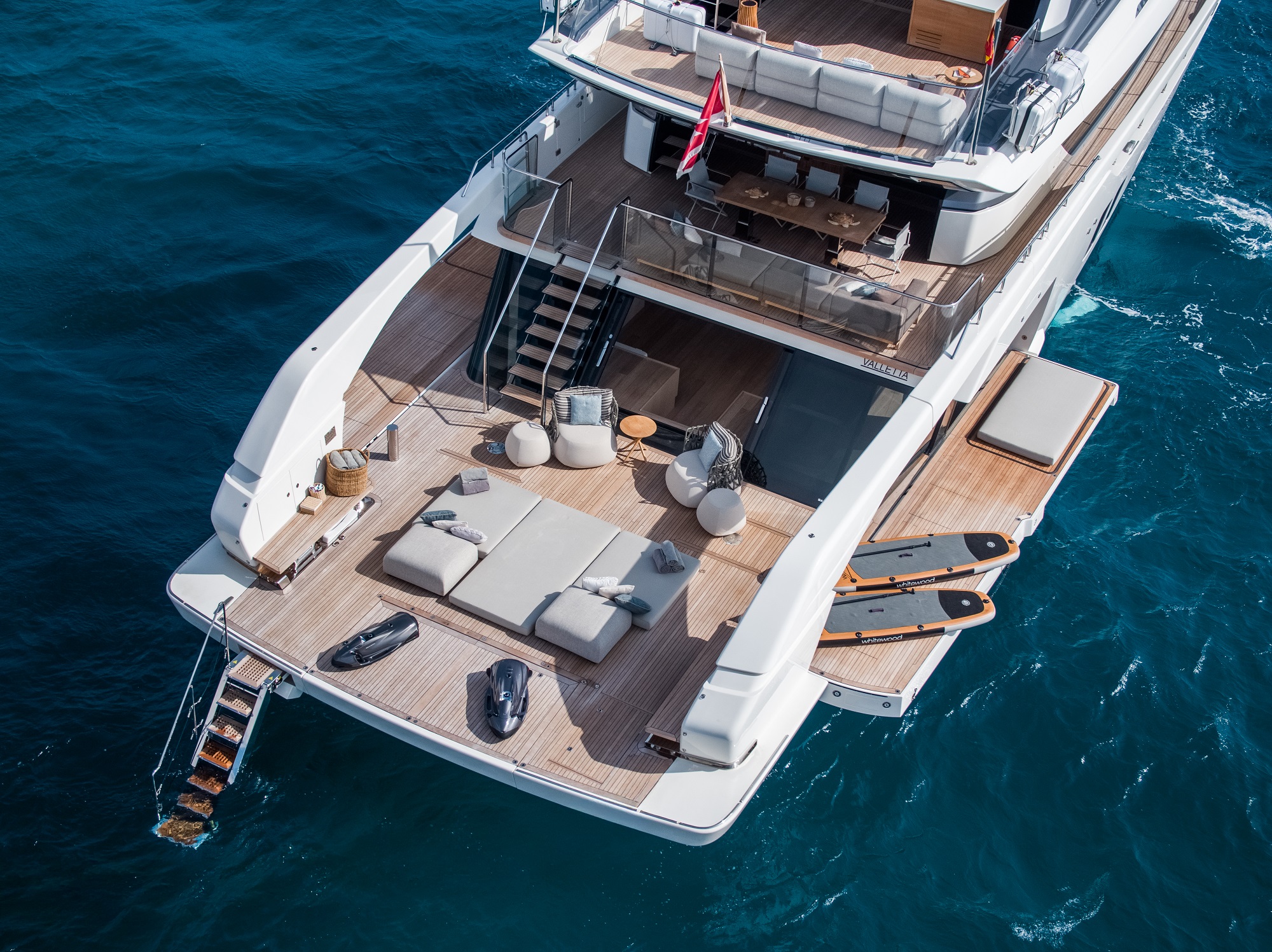 She boasts all the premium facilities guests expect including fabulous beach club, a jacuzzi plus accommodation for up to 11 guests in five suites.