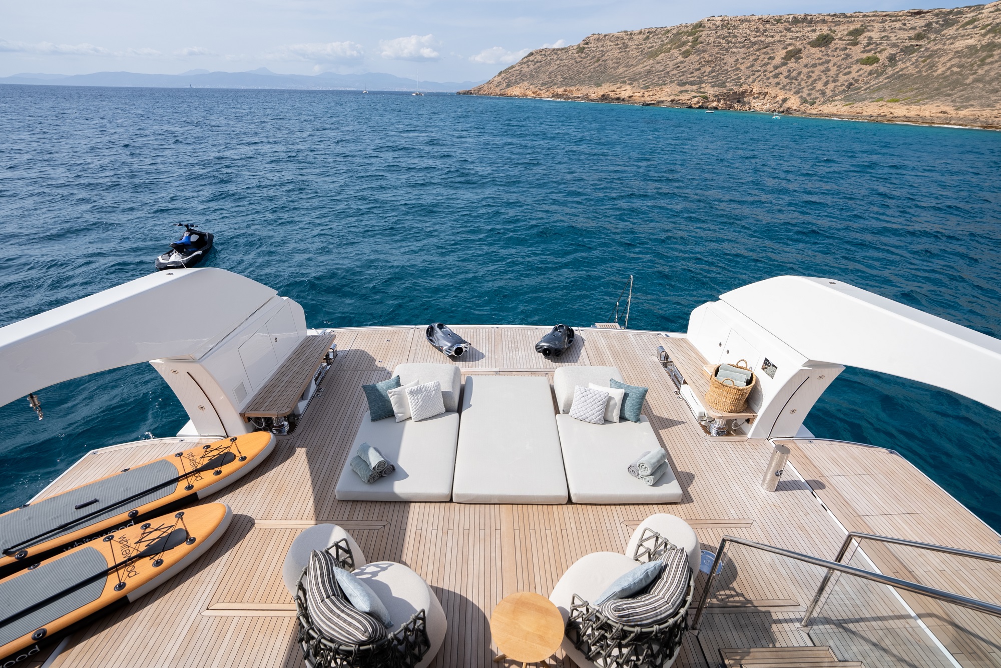The main deck aft hosts an intimate dining table sheltered from the sun by the flybridge overhang while the bow of the main deck is given over to the jacuzzi which is surrounded by sun pads inviting guests to relax and take in the views.