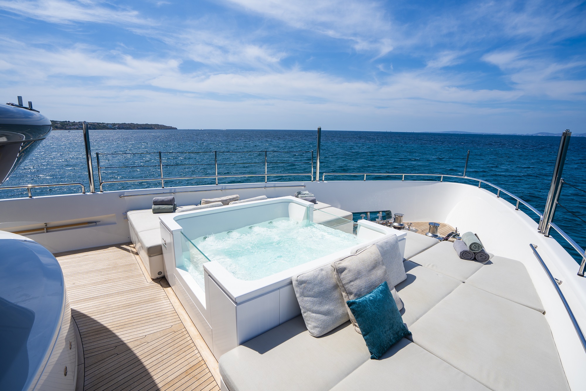 The main deck aft hosts an intimate dining table sheltered from the sun by the flybridge overhang while the bow of the main deck is given over to the jacuzzi which is surrounded by sun pads inviting guests to relax and take in the views.