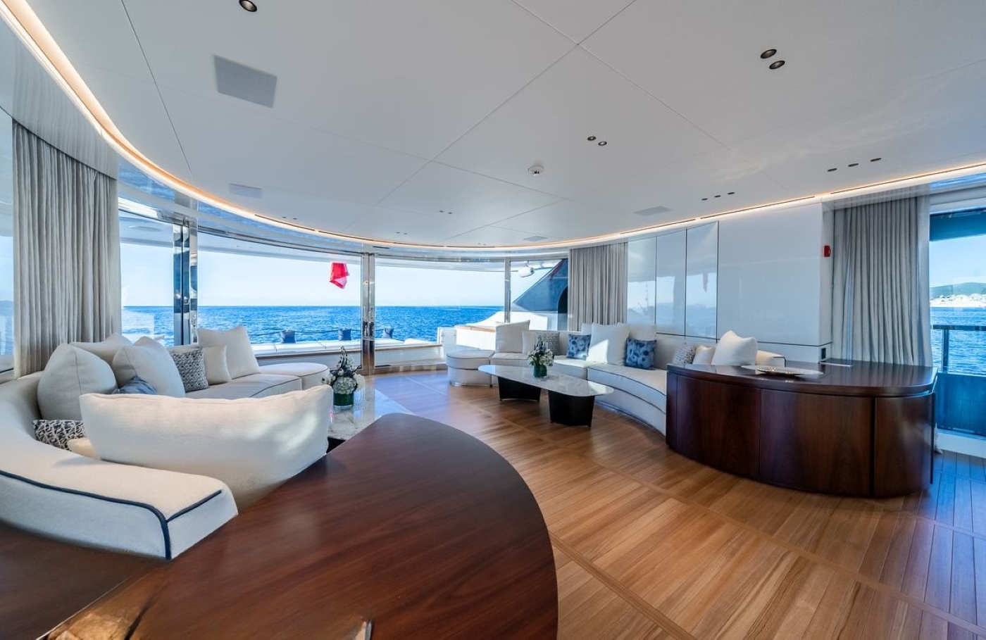 Her main salon is flooded with natural light and is configured with circular seated sofas and a forward bar creating a cool, informal vibe. Sweeping circular glass doors open the space and connect it with the beach club.