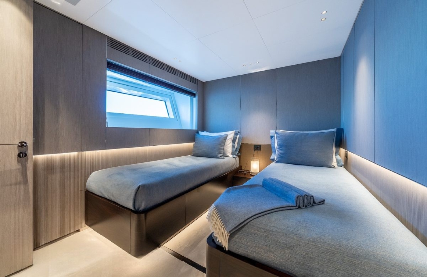 Accommodation on board is offered for up to 10 charter guests in 5 cabins with additional cabins for 9 crew members.