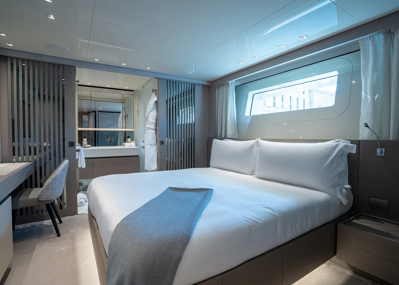 Accommodation is for up to ten guests in five suites with additional cabins for the seven crew members.