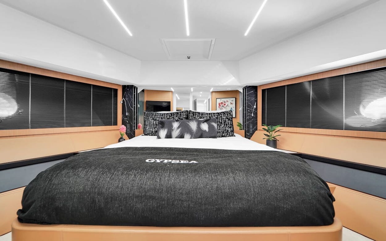 The open plan Master stateroom is aft and presents as a full suite complete with a comfortable full lounge and full beam ensuite and walk in wardrobe. Concealed behind mirrored glass at the foot of the bed is a large flat screen ...