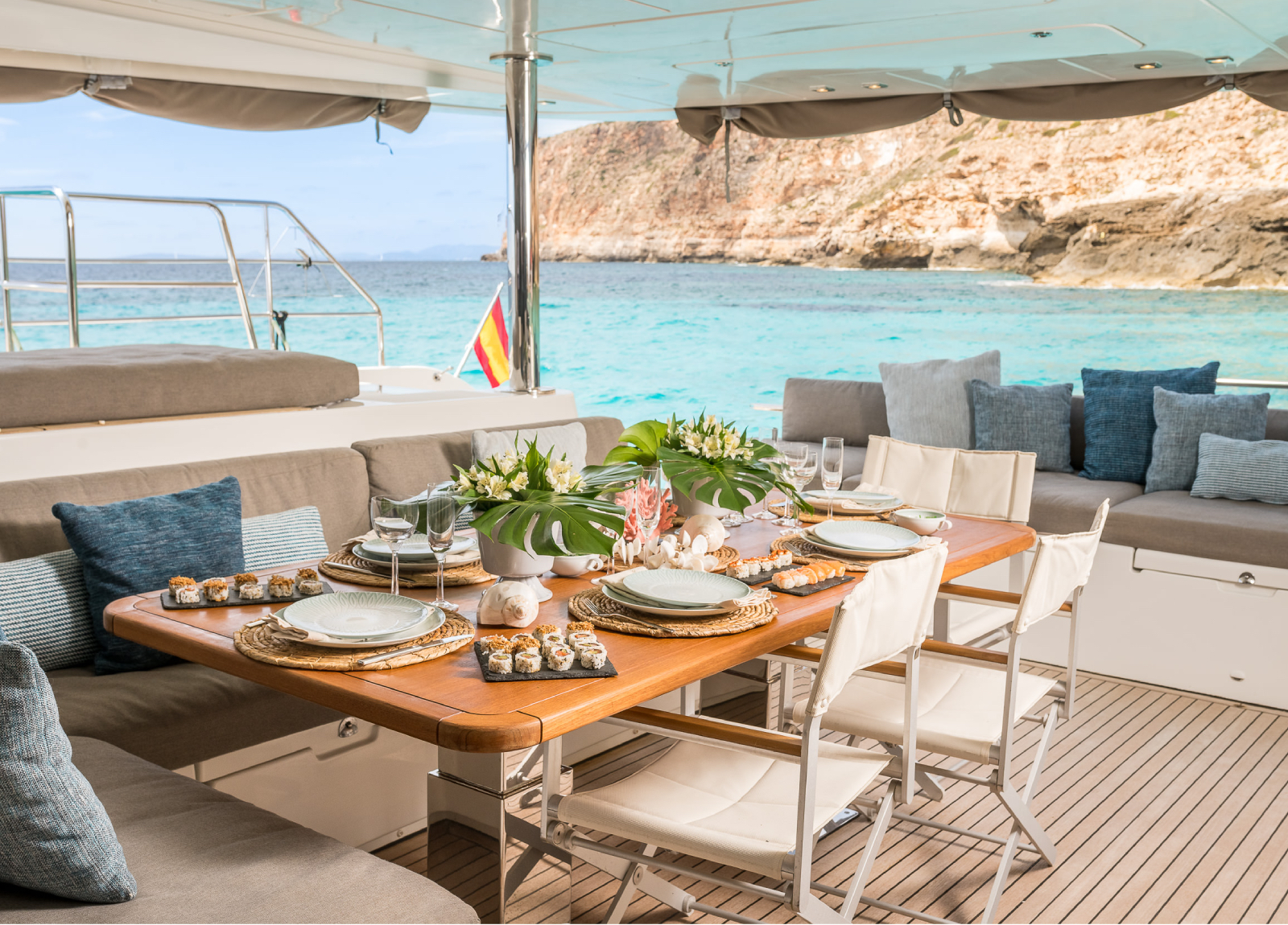 The catamaran offers incredibly generous deck areas, including a spacious flybridge with a dining and sunbathing area where guests can make the most of the long summer days.