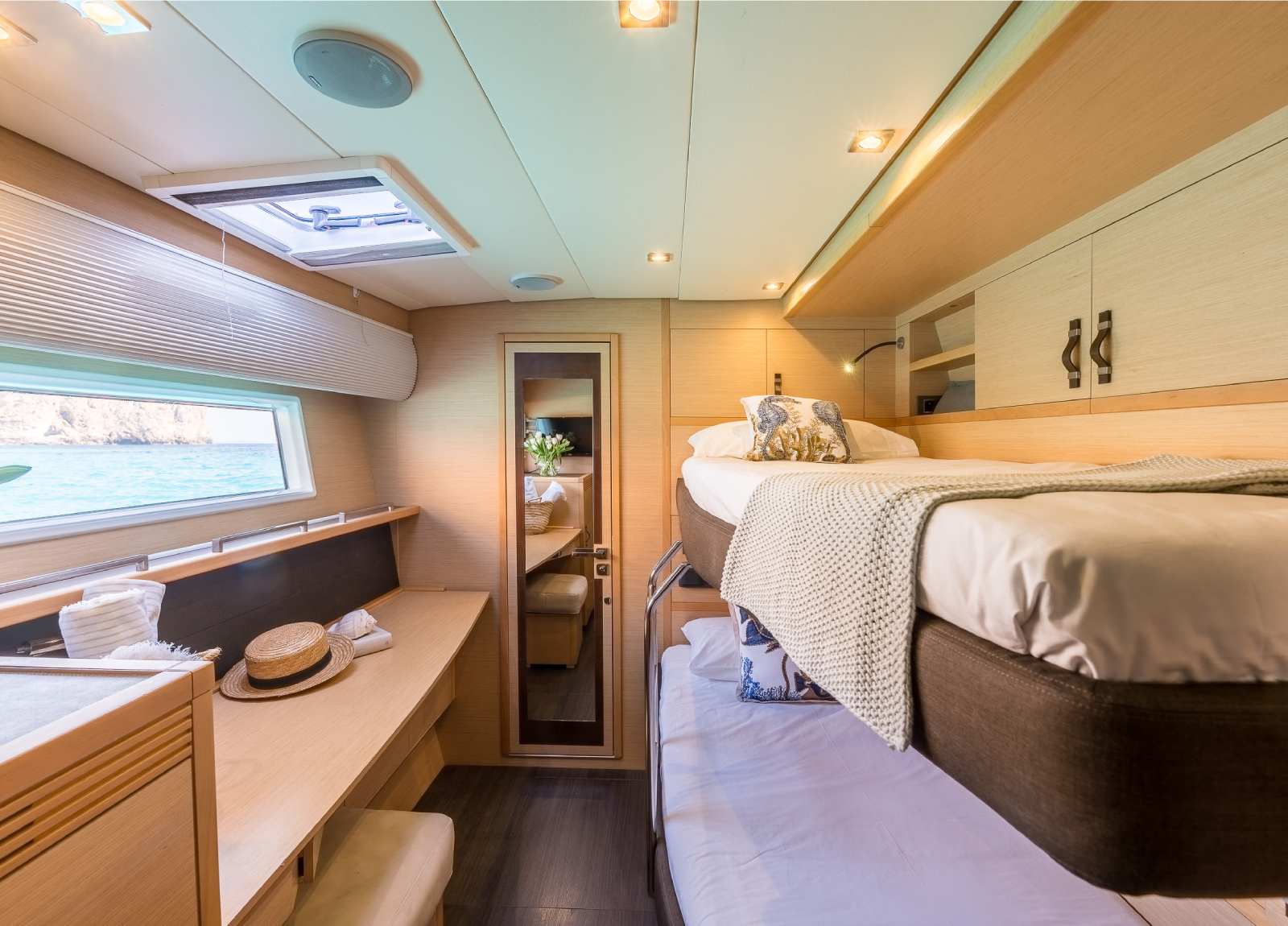 She can accommodate up to nine guests in four suites with additional cabins for the three crew members.
