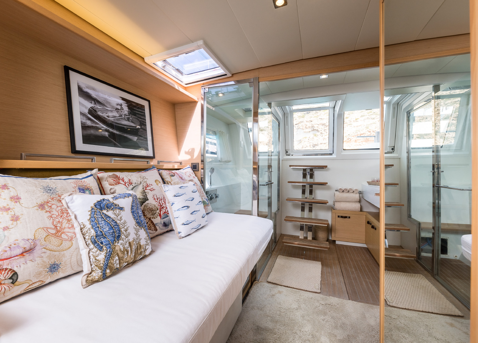 She can accommodate up to nine guests in four suites with additional cabins for the three crew members.
