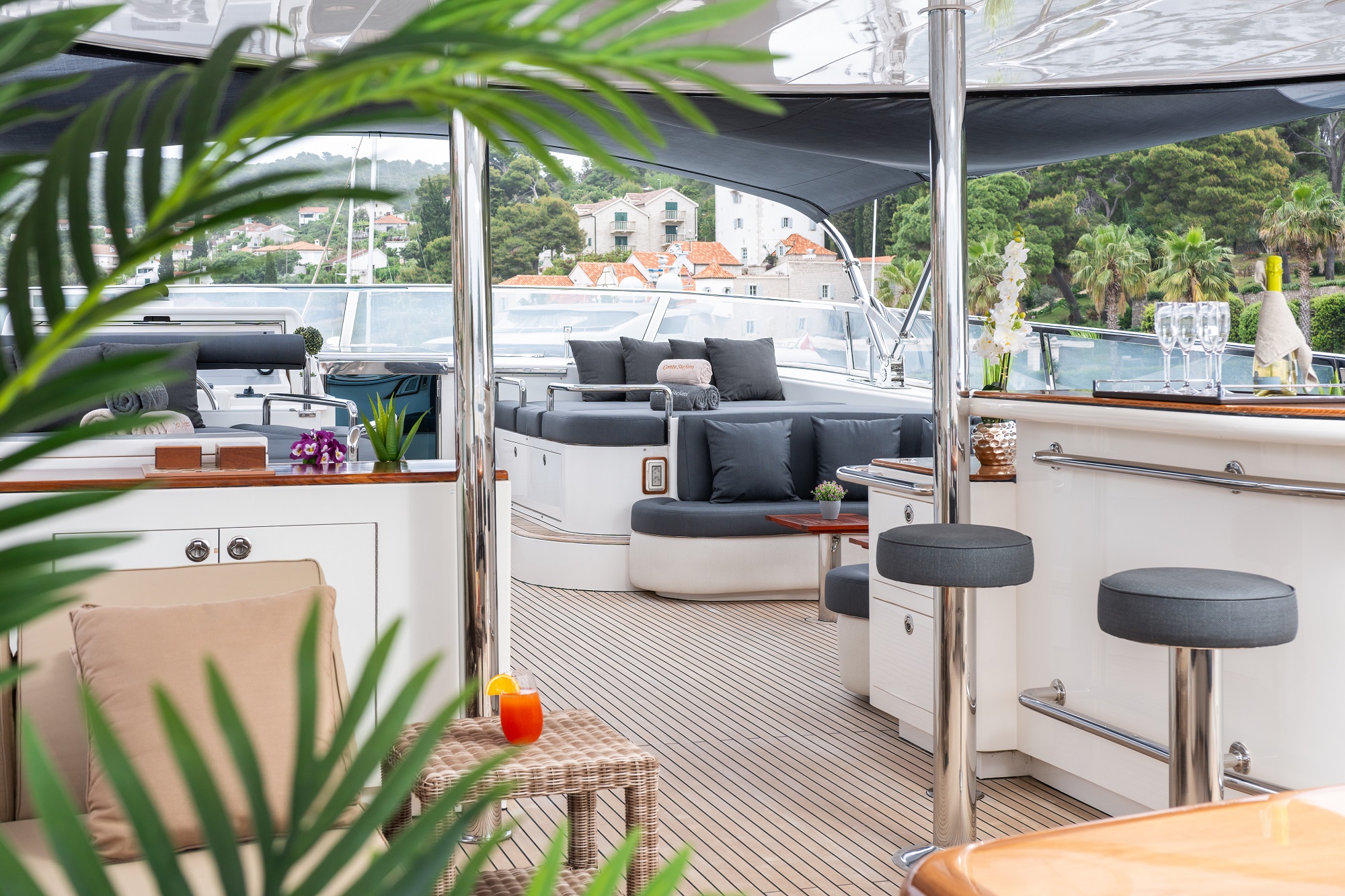 The exterior offers guests sociable spaces across the flybridge and main deck.