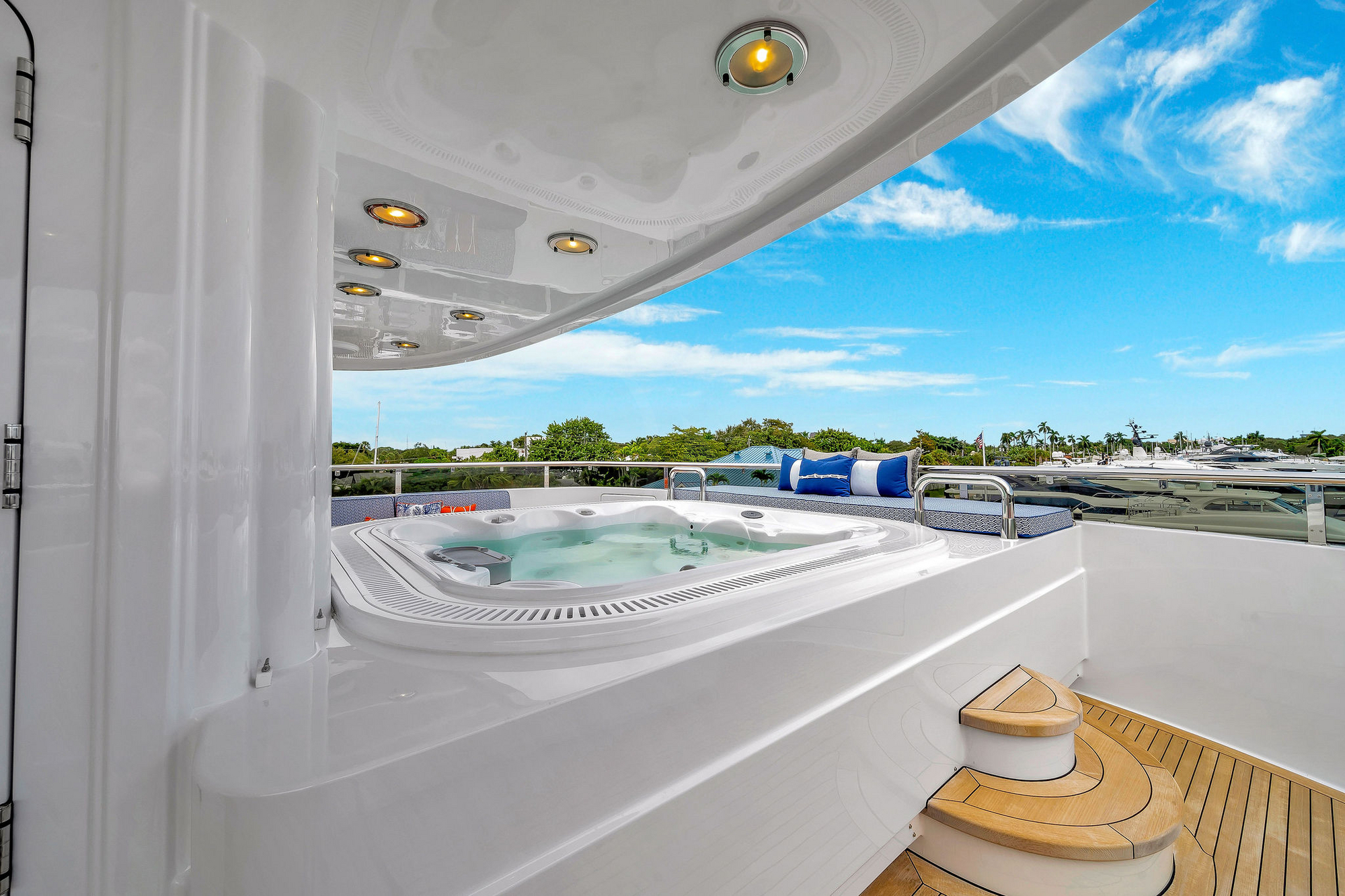 On the sun deck there is a row of elegant wooden sun lounges and tables forward, a curved sit up bar and BBQ amidships and semi-covered jacuzzi forward.