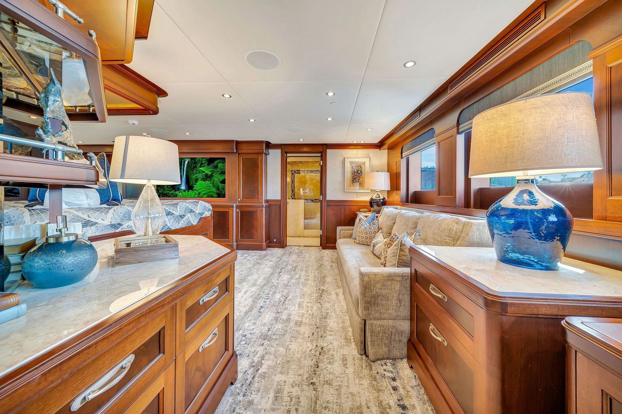 The master suite is full beam, forward on the main deck which features an office space, lounge area, king-sized bed and full beam ensuite bathroom. The ornate marble and wooden ensuite is forward with a full bathtub, shower, double sink and separate head.