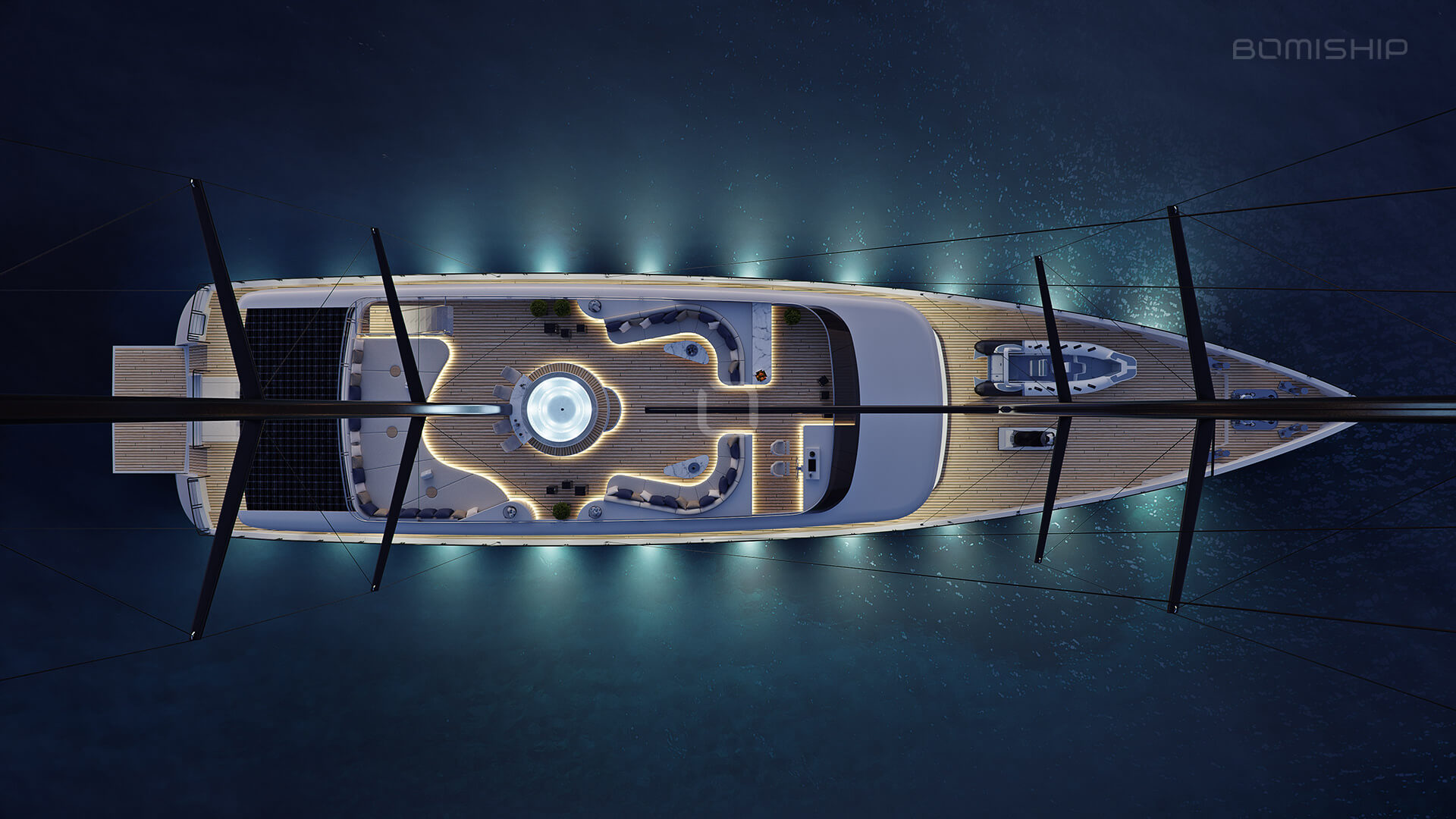 On the main deck aft there is a twelve-seater dining setting sheltered the overhang, a lounge space with coffee table and double sun pad. Steps lead down to the large beach swim platform at the water’s edge, ideal for guests to be close to the water or enjoy the water toys.