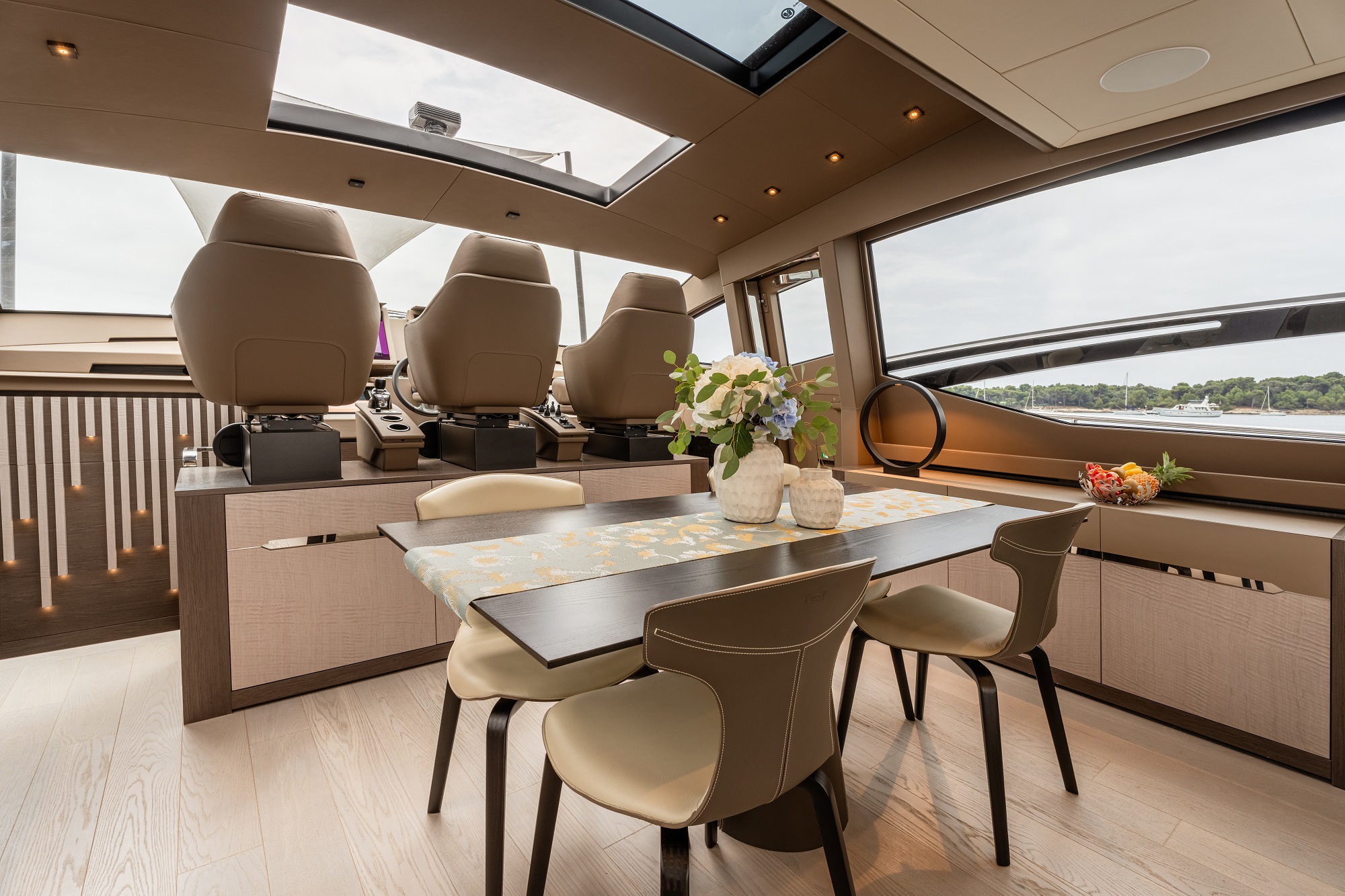 The helm station is located forward followed by the dining area and the seating area. The aft exterior has a nice al fresco dining possibility.