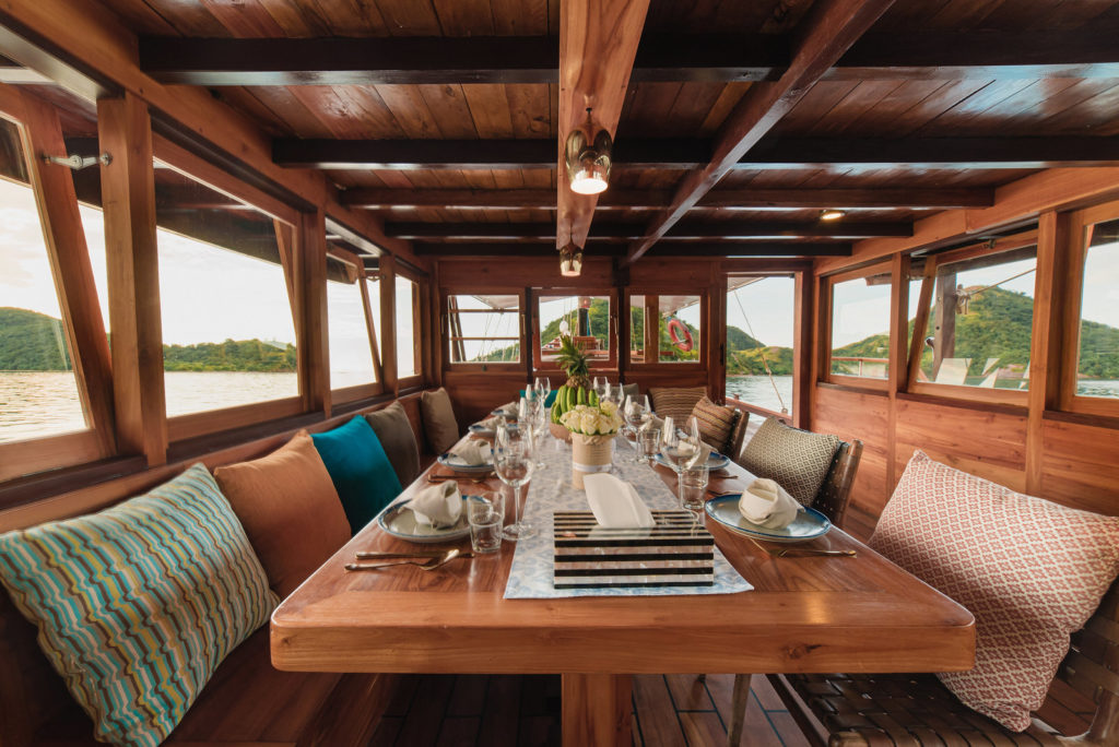 The interior reflects the phinisi traditions with authentic wood finishes and is configured with an open plan galley and dining area.
