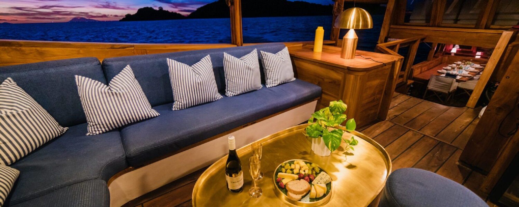 Forward is a shaded seating area with opposing cushioned sofas, a low coffee table and warm lighting.