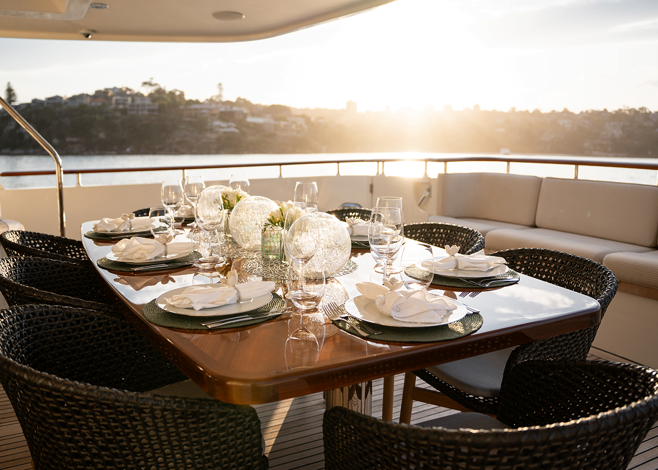 The sun deck can host guests all day with a dining setting and bar under the hard roof and an open deck with sun beds and a jacuzzi to aft. There is a second al fresco dining setting on the main deck aft where steps either side lead down to the swim platform.
