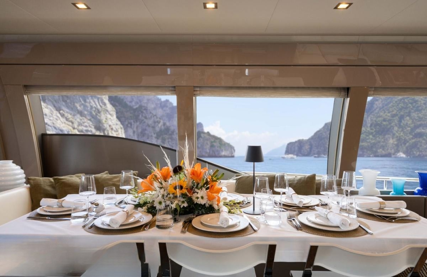 NOTABLE FEATURES OF SEA SONS: ~Ferretti quality design and build ~Two al fresco dining areas ~Stylish salon ~Comfortable cabins ~Air conditioning ~WiFi