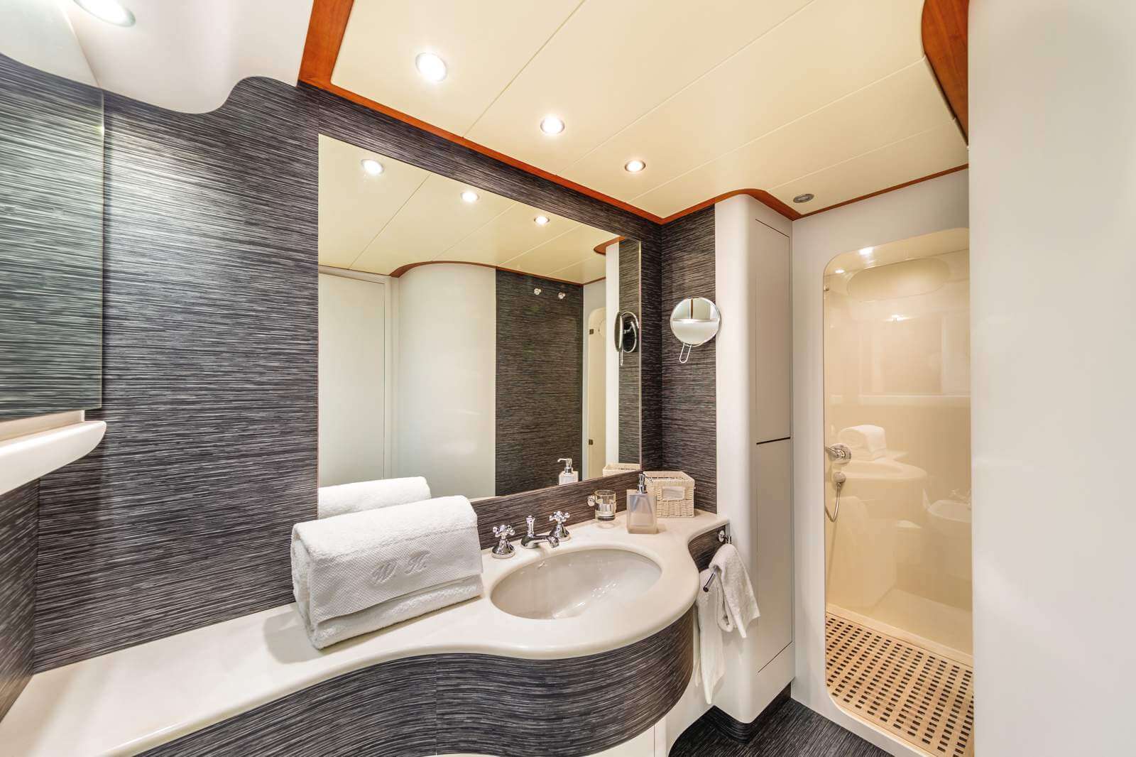 The décor reflects the wood tones seen on the main deck, plus the beds are made up with crisp white bed linen and the ensuite bathrooms are well appointed with a simple grey and white colour scheme. Tenders & Toys: