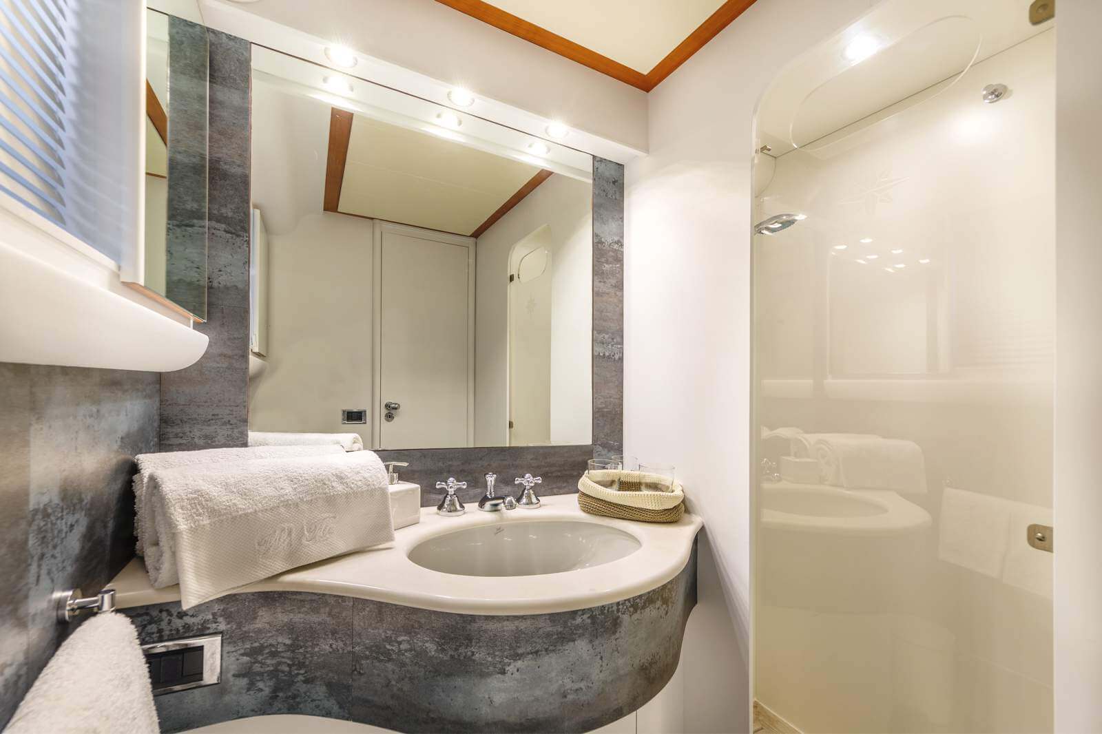 The décor reflects the wood tones seen on the main deck, plus the beds are made up with crisp white bed linen and the ensuite bathrooms are well appointed with a simple grey and white colour scheme. Tenders & Toys: