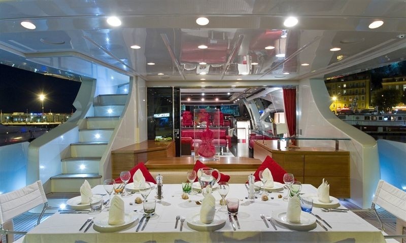 A stairway across is the flybridge, which hosts a seating area with a bar, under a Bimini top. The large transom garage is a place to store water toys and tenders, which the charter guests will appreciate when on their next yacht ...
