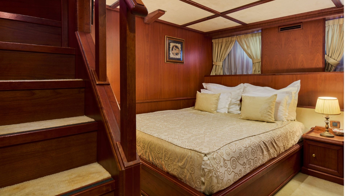 Both rooms have bathroom with shower. On the lower deck there is a master cabin also consisting of two rooms with queen size beds. The two rooms have one big common bathroom with Spa Pool and shower cabin. There is also a twin cabin and 2 double rooms both with queen beds all equipped with Sat TV, DVD, CD and a stereo.