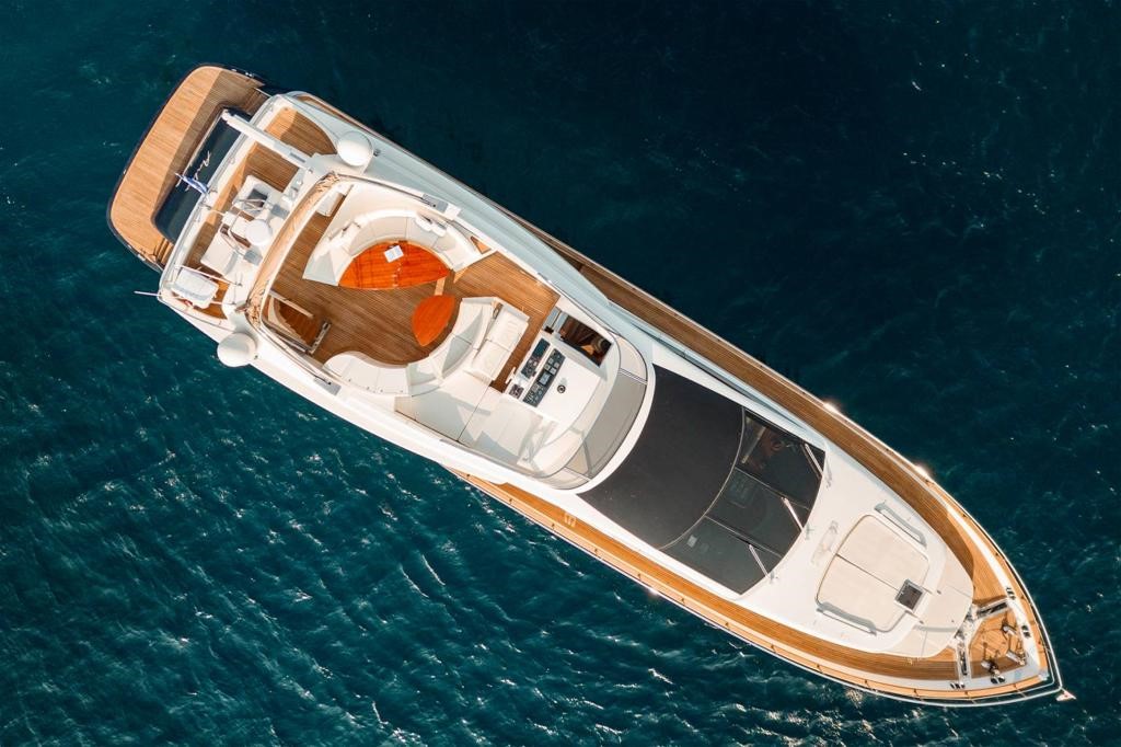Up shallow steps forward and semi-separated by a louvred wall finds the dining room featuring seating for up to six guests. Further forward is the wheelhouse. The accommodation is on the lower deck and is configured as a full beam master, VIP double and two twin suites.
