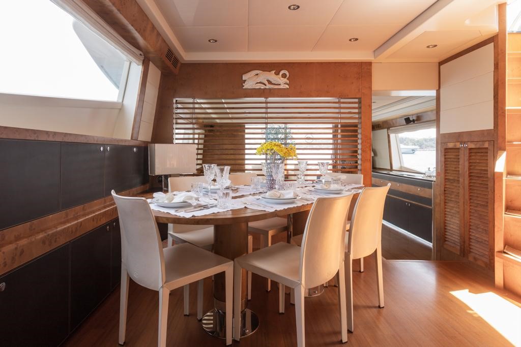 Up shallow steps forward and semi-separated by a louvred wall finds the dining room featuring seating for up to six guests. Further forward is the wheelhouse. The accommodation is on the lower deck and is configured as a full beam master, VIP double and two twin suites.